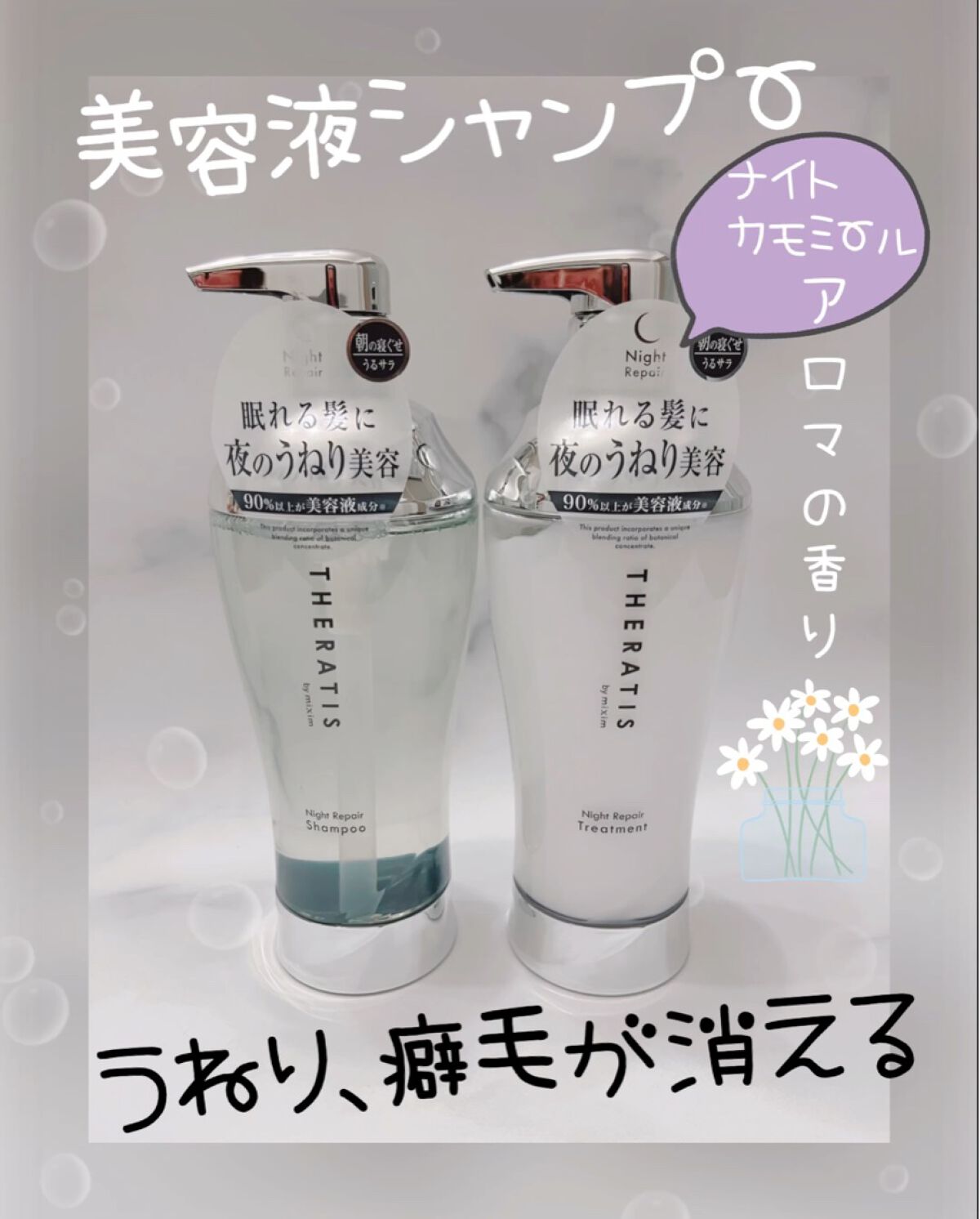 - ”寝ている間”に補修成分がしみ込み、うねり・寝ぐせを抑制する新ナイトリペアヘアケア。90%以上が美容液成分。 シャンプー:ラベンダー原料使用。ホホバオイル由来の洗浄成分でやさしく潤いを残しながら洗い上げます。ナイトラベンダーアロマの香り。ノンシリコンシャンプーです。 トリートメント:カモミール原料使用。補修成分が毛先まで包み込み潤いを与えます。ナイトカモミールアロマの香り。 石油系界面活性剤・合成着色料・ラウレス硫酸Na・パラベン・動物実験フリー処方