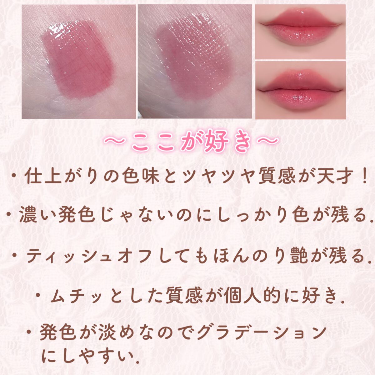・薄めに塗るとオレンジベージュでデイリー使いに凄くおすすめです. ・しっかり塗るとこっくりとしたブラウンベージュに発色して1本でふんわりナチュラルもこっくり深めのカラーも楽しめます♡ ・濃いめに塗ってすぐにマスクをしたり拭き取ってしまうと割とベタっと取れてしまうので、数分時間を置いてからティッシュで軽くオフするとマスクにも付きにくく色も長持ちします. ・塗ってすぐはペタペタする感じがするので、軽くティッシュオフする事をおすすめします. ・ティントには珍しいニュアンスカラーで、青みピンクに染まることもなくふわっふわの唇になれます☽・:* ・割と乾燥しやすいので、唇の皮が剥けやすい人は保湿用のリップと使うことをおすすめします⚠︎