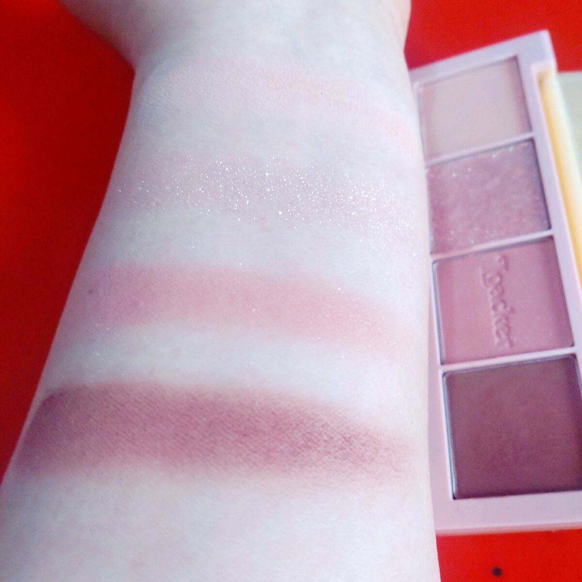 プチプラのクオリティじゃないっ!! 発売前からチェックしていたけれど、ここまで可愛いとは…😆 絶妙カラーで目もとのくすみを飛ばして*明るい印象に🩷 横割りグラデーションでメイクし、立体感をより出したかったので最後に1番左のカラーを上まぶたの真ん中と涙袋にのせています🙆 肌馴染みも良くて粉飛びも感じにくかったです💕 ブラウンの方も店頭に出てたら買おうかな💓