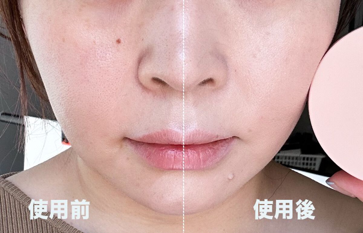つけたては、しみ、毛穴、赤みや色むらまでしっかりカバーされます。 ツヤ感もいい感じ。「グローカバー」というだけあって、一気に水感たっぷりのプリッとした肌にしてくれるので、面倒なベースメイクをしなくてもこれ一つでいい感じになります! 結構均一な色付きなので、目元や口元までしっかりカバーされます。コンシーラー不要です。 時間が経つとともにだんだんと色も馴染んできて、シアー感が出てきます。しっかりカバーしたい場合は、こまめに重ね付けした方がいいかも。