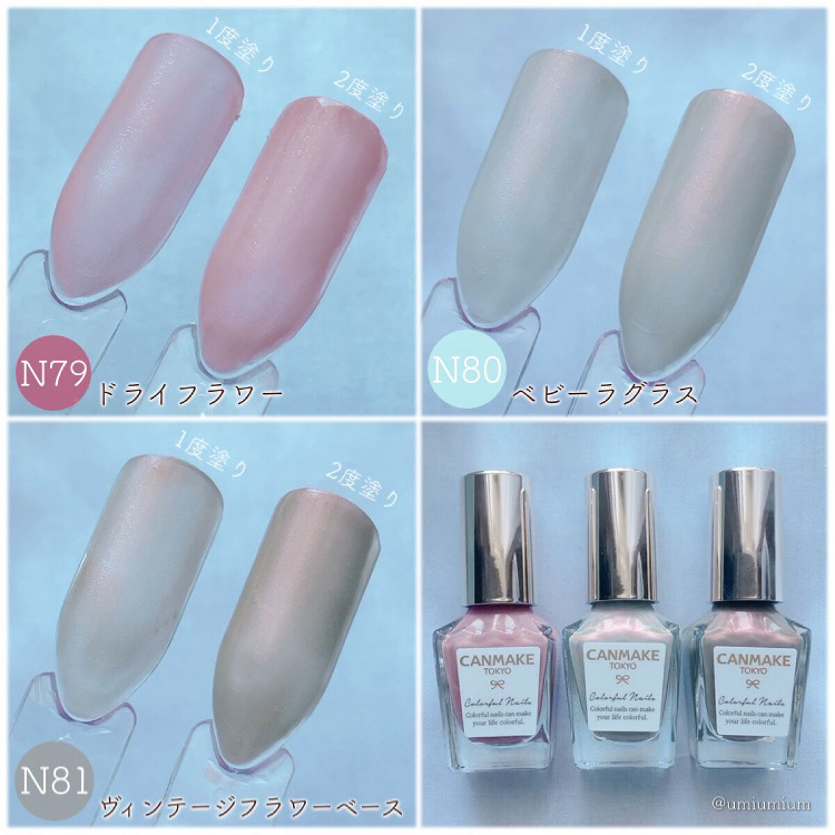 - <N02 シックボルドー> 酢酸ブチル、酢酸エチル、ニトロセルロース、(アジピン酸/ネオペンチルグリコール/無水トリメリト酸)コポリマー、クエン酸アセチルトリブチル、イソプロパノール、アクリレーツコポリマー、ステアラルコニウムベントナイト、酸化鉄、ブタノール、オキシベンゾン-1、シリカ、赤220、ジアセトンアルコール、酸化チタン、リン酸、カーボンブラック、ジ安息香酸トリメチルペンタンジイル、黄4、赤226 [旧]酢酸ブチル、酢酸エチル、ニトロセルロース、(アジピン酸/ネオペンチルグリコール/無水トリメリト酸)コポリマー、クエン酸アセチルトリブチル、イソプロパノール、アクリレーツコポリマー、ステアラルコニウムベントナイト、(スチレン/アクリレーツ)コポリマー、酸化鉄、ブタノール、シリカ、オキシベンゾン-1、赤220、ジアセトンアルコール、酸化チタン、ジ安息香酸トリメチルペンタンジイル、リン酸、カーボンブラック、黄4 <N08 ミスティモーヴ> 酢酸ブチル、酢酸エチル、ニトロセルロース、(アジピン酸/ネオペンチルグリコール/無水トリメリト酸)コポリマー、クエン酸アセチルトリブチル、イソプロパノール、アクリレーツコポリマー、ステアラルコニウムベントナイト、酸化チタン、ブタノール、シリカ、オキシベンゾン-1、マンガンバイオレット、ジアセトンアルコール、酸化鉄、赤226、リン酸、カオリン、ジ安息香酸トリメチルペンタンジイル、黄4 [旧] 酢酸ブチル、酢酸エチル、ニトロセルロース、(アジピン酸/ネオペンチルグリコール/無水トリメリト酸)コポリマー、クエン酸アセチルトリブチル、イソプロパノール、アクリレーツコポリマー、ステアラルコニウムベントナイト、(スチレン/アクリレーツ)コポリマー、酸化チタン、ブタノール、オキシベンゾン-1、シリカ、酸化鉄、ジアセトンアルコール、マンガンバイオレット、ジ安息香酸トリメチルペンタンジイル、リン酸、カーボンブラック、黄4 <N10 ペールラベンダー> 酢酸ブチル、酢酸エチル、ニトロセルロース、(アジピン酸/ネオペンチルグリコール/無水トリメリト酸)コポリマー、クエン酸アセチルトリブチル、イソプロパノール、アクリレーツコポリマー、ステアラルコニウムベントナイト、酸化チタン、ブタノール、酸化鉄、オキシベンゾン-1、シリカ、ジアセトンアルコール、マンガンバイオレット、リン酸、ジ安息香酸トリメチルペンタンジイル、黄4、赤226 [旧]酢酸ブチル、酢酸エチル、ニトロセルロース、(アジピン酸/ネオペンチルグリコール/無水トリメリト酸)コポリマー、クエン酸アセチルトリブチル、イソプロパノール、アクリレーツコポリマー、ステアラルコニウムベントナイト、酸化チタン、ブタノール、シリカ、オキシベンゾン-1、ジアセトンアルコール、酸化鉄、ジ安息香酸トリメチルペンタンジイル、マンガンバイオレット、リン酸、黄4 <N12 アーモンドグリーン> 酢酸ブチル、酢酸エチル、ニトロセルロース、(アジピン酸/ネオペンチルグリコール/無水トリメリト酸)コポリマー、クエン酸アセチルトリブチル、イソプロパノール、アクリレーツコポリマー、ステアラルコニウムベントナイト、(スチレン/アクリレーツ)コポリマー、酸化チタン、ブタノール、シリカ、オキシベンゾン-1、ジアセトンアルコール、ジ安息香酸トリメチルペンタンジイル、黄4、カーボンブラック、リン酸、コンジョウ <N16 ココア> 酢酸ブチル、酢酸エチル、ニトロセルロース、(アジピン酸/ネオペンチルグリコール/無水トリメリト酸)コポリマー、クエン酸アセチルトリブチル、イソプロパノール、酸化チタン、アクリレーツコポリマー、ステアラルコニウムベントナイト、酸化鉄、ブタノール、シリカ、オキシベンゾン-1、ジアセトンアルコール、黄4、リン酸、ジ安息香酸トリメチルペンタンジイル、カーボンブラック、赤226 [旧]酢酸ブチル、酢酸エチル、ニトロセルロース、(アジピン酸/ネオペンチルグリコール/無水トリメリト酸)コポリマー、クエン酸アセチルトリブチル、イソプロパノール、酸化チタン、アクリレーツコポリマー、ステアラルコニウムベントナイト、ブタノール、酸化鉄、シリカ、オキシベンゾン-1、ジアセトンアルコール、ジ安息香酸トリメチルペンタンジイル、黄4、リン酸、カーボンブラック <N17 クリームチャイ> 酢酸ブチル、酢酸エチル、ニトロセルロース、(アジピン酸/ネオペンチルグリコール/無水トリメリト酸)コポリマー、クエン酸アセチルトリブチル、イソプロパノール、アクリレーツコポリマー、ステアラルコニウムベントナイト、(スチレン/アクリレーツ)コポリマー、酸化チタン、ブタノール、シリカ、オキシベンゾン-1、ジアセトンアルコール、ジ安息香酸トリメチルペンタンジイル、酸化鉄、リン酸、黄4、カーボンブラック <N19 スウィートコーラル> 酢酸ブチル、酢酸エチル、ニトロセルロース、(アジピン酸/ネオペンチルグリコール/無水トリメリト酸)コポリマー、クエン酸アセチ