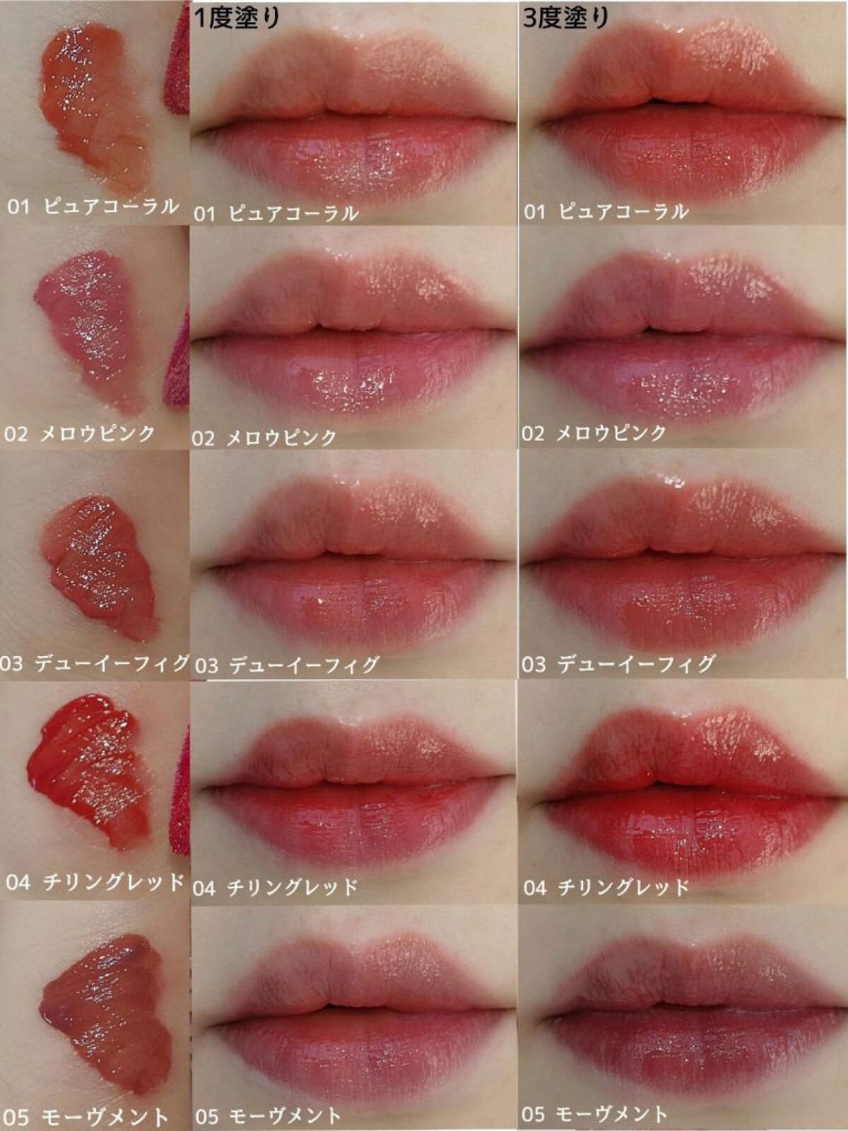 - <ピュアコーラル> 水、トリメチルシロキシフェニルジメチコン、オクチルドデカノール、ダイマージリノール酸ダイマージリノレイルビス(ベヘニル/イソステアリル/フィトステリル)、ポリアミド-8、リンゴ酸ジイソステアリル、ポリソルベート60、BG、セタノール、グリセリン、セスキオレイン酸ソルビタン、変性アルコール、(アクリル酸ヒドロキシエチル/アクリロイルジメチルタウリンNa)コポリマー、ヨーロッパキイチゴ葉エキス、(カプリル酸/カプリン酸)ヤシアルキル、加水分解ヒアルロン酸、(ヒマシ油/IPDI)コポリマー、(カプリル酸/カプリン酸/コハク酸)トリグリセリル、エチルヘキシルグリセリン、トリ(カプリル酸/カプリン酸)グリセリル、カプリリルグリコール、1,2-ヘキサンジオール、トコフェロール、ポリアクリレート-13、ポリイソブテン、テトラ(ジ-t-ブチルヒドロキシヒドロケイヒ酸)ペンタエリスリチル、イソステアリン酸ソルビタン、ポリソルベート20、デヒドロ酢酸、フィチン酸Na、香料、酸化チタン、黄5、赤227、青1 <メロウピンク> 水、トリメチルシロキシフェニルジメチコン、オクチルドデカノール、ダイマージリノール酸ダイマージリノレイルビス(ベヘニル/イソステアリル/フィトステリル)、ポリアミド-8、リンゴ酸ジイソステアリル、ポリソルベート60、BG、セタノール、グリセリン、セスキオレイン酸ソルビタン、変性アルコール、(アクリル酸ヒドロキシエチル/アクリロイルジメチルタウリンNa)コポリマー、ヨーロッパキイチゴ葉エキス、(カプリル酸/カプリン酸)ヤシアルキル、加水分解ヒアルロン酸、(ヒマシ油/IPDI)コポリマー、(カプリル酸/カプリン酸/コハク酸)トリグリセリル、エチルヘキシルグリセリン、トリ(カプリル酸/カプリン酸)グリセリル、カプリリルグリコール、1,2-ヘキサンジオール、トコフェロール、ポリアクリレート-13、ポリイソブテン、テトラ(ジ-t-ブチルヒドロキシヒドロケイヒ酸)ペンタエリスリチル、イソステアリン酸ソルビタン、ポリソルベート20、デヒドロ酢酸、フィチン酸Na、香料、酸化チタン、黄5、赤227、青1 <デューイーフィグ> 水、トリメチルシロキシフェニルジメチコン、オクチルドデカノール、ダイマージリノール酸ダイマージリノレイルビス(ベヘニル/イソステアリル/フィトステリル)、ポリアミド-8、リンゴ酸ジイソステアリル、ポリソルベート60、BG、セタノール、グリセリン、セスキオレイン酸ソルビタン、変性アルコール、(アクリル酸ヒドロキシエチル/アクリロイルジメチルタウリンNa)コポリマー、ヨーロッパキイチゴ葉エキス、(カプリル酸/カプリン酸)ヤシアルキル、加水分解ヒアルロン酸、(ヒマシ油/IPDI)コポリマー、(カプリル酸/カプリン酸/コハク酸)トリグリセリル、エチルヘキシルグリセリン、トリ(カプリル酸/カプリン酸)グリセリル、カプリリルグリコール、1,2-ヘキサンジオール、トコフェロール、ポリアクリレート-13、ポリイソブテン、テトラ(ジ-t-ブチルヒドロキシヒドロケイヒ酸)ペンタエリスリチル、イソステアリン酸ソルビタン、ポリソルベート20、デヒドロ酢酸、フィチン酸Na、香料、酸化チタン、黄5、赤227、青1 <チリングレッド> 水、トリメチルシロキシフェニルジメチコン、オクチルドデカノール、ダイマージリノール酸ダイマージリノレイルビス(ベヘニル/イソステアリル/フィトステリル)、ポリアミド-8、リンゴ酸ジイソステアリル、ポリソルベート60、BG、セタノール、グリセリン、セスキオレイン酸ソルビタン、変性アルコール、(アクリル酸ヒドロキシエチル/アクリロイルジメチルタウリンNa)コポリマー、ヨーロッパキイチゴ葉エキス、(カプリル酸/カプリン酸)ヤシアルキル、加水分解ヒアルロン酸、(ヒマシ油/IPDI)コポリマー、(カプリル酸/カプリン酸/コハク酸)トリグリセリル、エチルヘキシルグリセリン、トリ(カプリル酸/カプリン酸)グリセリル、カプリリルグリコール、1,2-ヘキサンジオール、トコフェロール、ポリアクリレート-13、ポリイソブテン、テトラ(ジ-t-ブチルヒドロキシヒドロケイヒ酸)ペンタエリスリチル、イソステアリン酸ソルビタン、ポリソルベート20、デヒドロ酢酸、フィチン酸Na、香料、黄5、赤227、青1 <モーヴメント> 水、トリメチルシロキシフェニルジメチコン、オクチルドデカノール、ダイマージリノール酸ダイマージリノレイルビス(ベヘニル/イソステアリル/フィトステリル)、ポリアミド-8、リンゴ酸ジイソステアリル、ポリソルベート60、BG、セタノール、グリセリン、セスキオレイン酸ソルビタン、変性アルコール、(アクリル酸ヒドロキシエチル/アクリロイルジメチルタウリンNa)コポリマー、ヨーロッパキイチゴ葉エキス、(カプリル酸/カプリン酸)ヤシアルキル、加水分解ヒアルロン酸、(ヒマシ油/IPDI)コポリマー、(カプリル酸/カプリン酸/コハク酸)トリグリセリル、エチルヘキシルグリセリン、トリ(カプリル酸/カプリン酸)グリセリル、カプリリルグリコール、1,2-ヘキサンジオール、トコフェロ