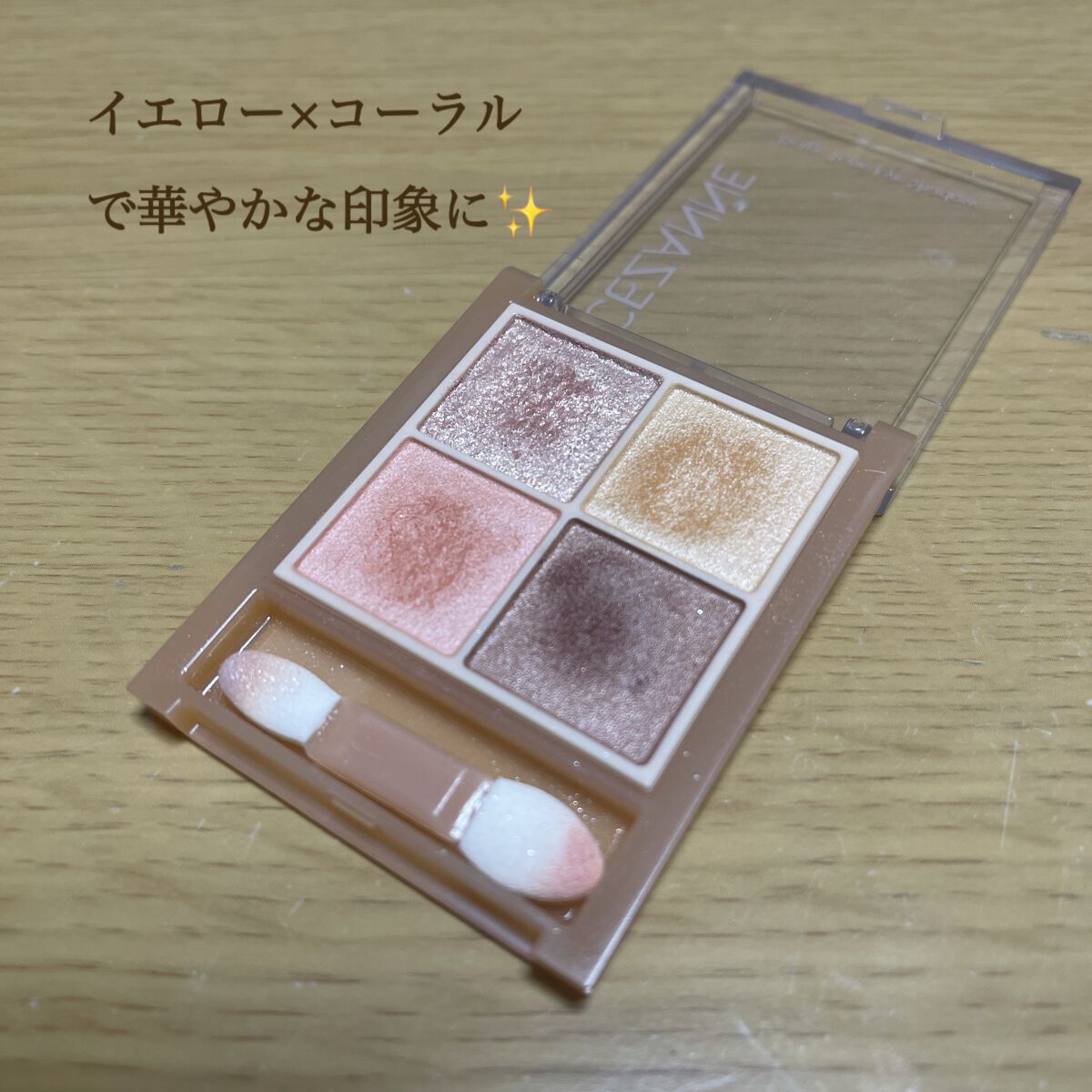 - ラメ・パール・マット3質感の4色アイシャドウ。 肌馴染みの良いベージュを基調としたカラー。ラメ・パール・マットの3質感を重ねて、自然にまぶたを強調し奥行のある大きな目元へ。 しっとり溶け込むような柔らかなパウダーなので、スルスル伸びてまぶたにピタッと密着。保湿成分(スクワラン・ホホバ種子油)配合。