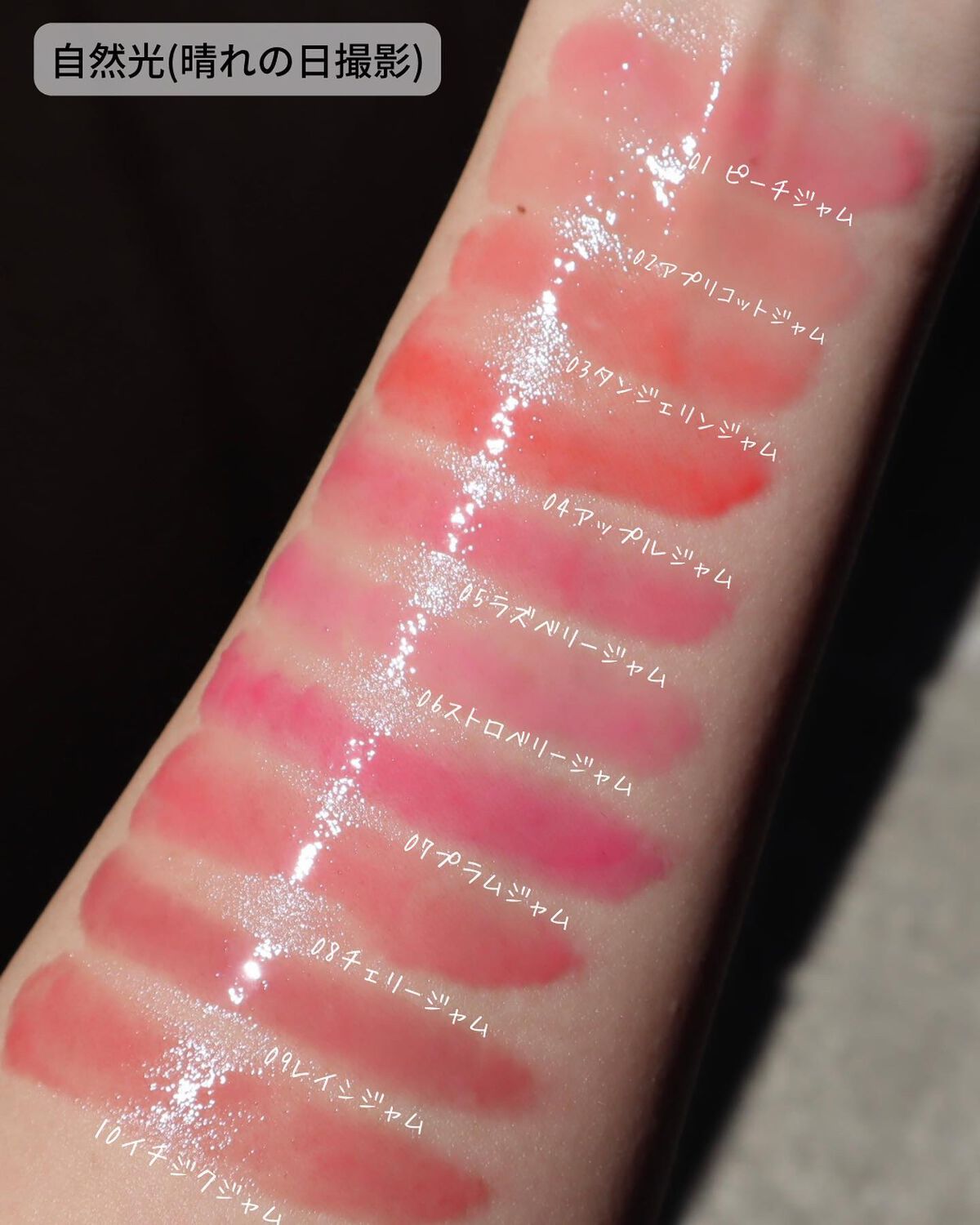 - <01 ピーチジャム> 水添ポリイソブテン、ダイマージリノール酸(フィトステリル/イソステアリル/セチル/ステアリル/ベヘニル)、ダイマージリノール酸 ダイマージリノレイルビス(ベヘニル/イソステアリル/フィトステリル)、ビスジグリセリルポリアシルアジペート-2、リンゴ種子油、リ ンゴ酸ジイソステアリル、マイクロクリスタリンワックス、ヒマシ油、(水添ヒマシ油/セバシン酸)コポリマー、アーモンド油、アサイヤシ 果実エキス、フラガリアチロエンシス果実エキス、クコ果実エキス、クロミグワ果実エキス、クロフサスグリ果実エキス、セイヨウヤブイ チゴ果実エキス、ヨーロッパキイチゴ果実エキス、ローブッシュブルーベリー果実エキス、クランベリー果実エキス、ビルベリー果実エ キス、酢酸ステアリン酸スクロース、合成フルオロフロゴパイト、合成ワックス、マカデミアナッツ脂肪酸フィトステリル、シリル化シリカ、( エチレン/プロピレン)コポリマー、トリイソステアリン酸ポリグリセリル-2、カプリリルグリコール、カプリル酸グリセリル、ジイソステ アリン酸ポリグリセリル-2、水、BG、エチルヘキシルグリセリン、フェノキシエタノール、ベンジルアルコール、リモネン、酸化チタン、黄 4、赤201、赤218、赤202 <02 アプリコットジャム> 水、香料、赤202、赤104 (1) 酸化鉄、水添ポリイソブテン、ダイマージリノール酸(フィトステリル/イソステアリル/セチル/ステ アリル/ベヘニル)、ダイマージリノール酸ダイマージリノレイルビス(ベヘニル/イソステアリル/フィトステリル)、ビスジグリセリル ポリアシルアジペートー2、リンゴ種子油、リンゴ酸ジイソステアリル、マイクロクリスタリンワックス、ヒマシ油、(水添ヒマシ油/セバ シン酸)コポリマー、アーモンド油、アサイヤシ果実エキス、フラガリアチロエンシス果実エキス、クコ果実エキス、クロミグワ果実エキス クロフサスグリ果実エキス、セイヨウヤブイチゴ果実エキス、ヨーロッパキイチゴ果実エキス、ローブッシュブルーベリー果実エキス、クランベリー果実エキス、ビルベリー果実エキス、酢酸ステアリン酸スクロース、合成フルオロフロゴパイト、合成ワックス、マカデミアナ ッツ脂肪酸フィトステリル、シリル化シリカ、(エチレン/プロピレン)コポリマー、トリイソステアリン酸ポリグリセリル-2、カプリリルグ リコール、カプリル酸グリセリル、ジイソステアリン酸ポリグリセリル-2、BG、エチルヘキシルグリセリン、フェノキシエタノール、ベンジ ルアルコール、リモネン、酸化チタン、赤218、赤201 <03 タンジェリンジャム> 水添ポリイソブテン、ダイマージリノール酸(フィトステリル/イソステアリル/セチル/ステアリル/ベヘニル)、ダイマージリノール酸 ダイマージリノレイルビス(ベヘニル/イソステアリル/フィトステリル)、ビスジグリセリルポリアシルアジペート-2、リンゴ種子油、リ ンゴ酸ジイソステアリル、マイクロクリスタリンワックス、ヒマシ油、(水添ヒマシ油/セバシン酸)コポリマー、アーモンド油、アサイヤシ 果実エキス、フラガリアチロエンシス果実エキス、クコ果実エキス、クロミグワ果実エキス、クロフサスグリ果実エキス、セイヨウヤブ イチゴ果実エキス、ヨーロッパキイチゴ果実エキス、ローブッシュブルーベリー果実エキス、クランベリー果実エキス、ビルベリー果実 エキス、酢酸ステアリン酸スクロース、合成フルオロフロゴパイト、合成ワックス、マカデミアナッツ脂肪酸フィトステリル、シリル化シリ 力 (エチレン/プロピレン)コポリマー、トリイソステアリン酸ポリグリセリル-2、カプリリルグリコール、カプリル酸グリセリル、ジイ ソステアリン酸ポリグリセリル-2、水、BG、エチルヘキシルグリセリン、フェノキシエタノール、香料、ベンジルアルコール、リモネン、黄4、赤201、酸化チタン、赤104(1)、酸化鉄 赤218、赤202 <04 アップルジャム> 水添ポリイソブテン、ダイマージリノール酸(フィトステリル/イソステアリル/セチル/ステアリル/ベヘニル)、ダイマージリノール酸 ダイマージリノレイルビス(ベヘニル/イソステアリル/フィトステリル)、ビスジグリセリルポリアシルアジペート-2、リンゴ種子油、リ ンゴ酸ジイソステアリル、マイクロクリスタリンワックス、ヒマシ油、水添ヒマシ油/セバシン酸)コポリマー、アーモンド油、アサイヤシ 果実エキス、フラガリアチロエンシス果実エキス、クコ果実エキス、クロミグワ果実エキス、クロフサスグリ果実エキス、セイヨウヤブイ チゴ果実エキス、ヨーロッパキイチゴ果実エキス、ローブッシュブルーベリー果実エキス、クランベリー果実エキス、ビルベリー果実エ キス、酢酸ステアリン酸スクロース、合成フルオロフロゴパイト、合成ワックス、マカデミアナッツ脂肪酸フィトステリル、シリル化シリカ (エチレン/プロピレン)コポリマー、トリイソステアリン酸ポリグリセリル-2、カプリリルグリコール、カプリル酸グリセリル、ジイソ ス