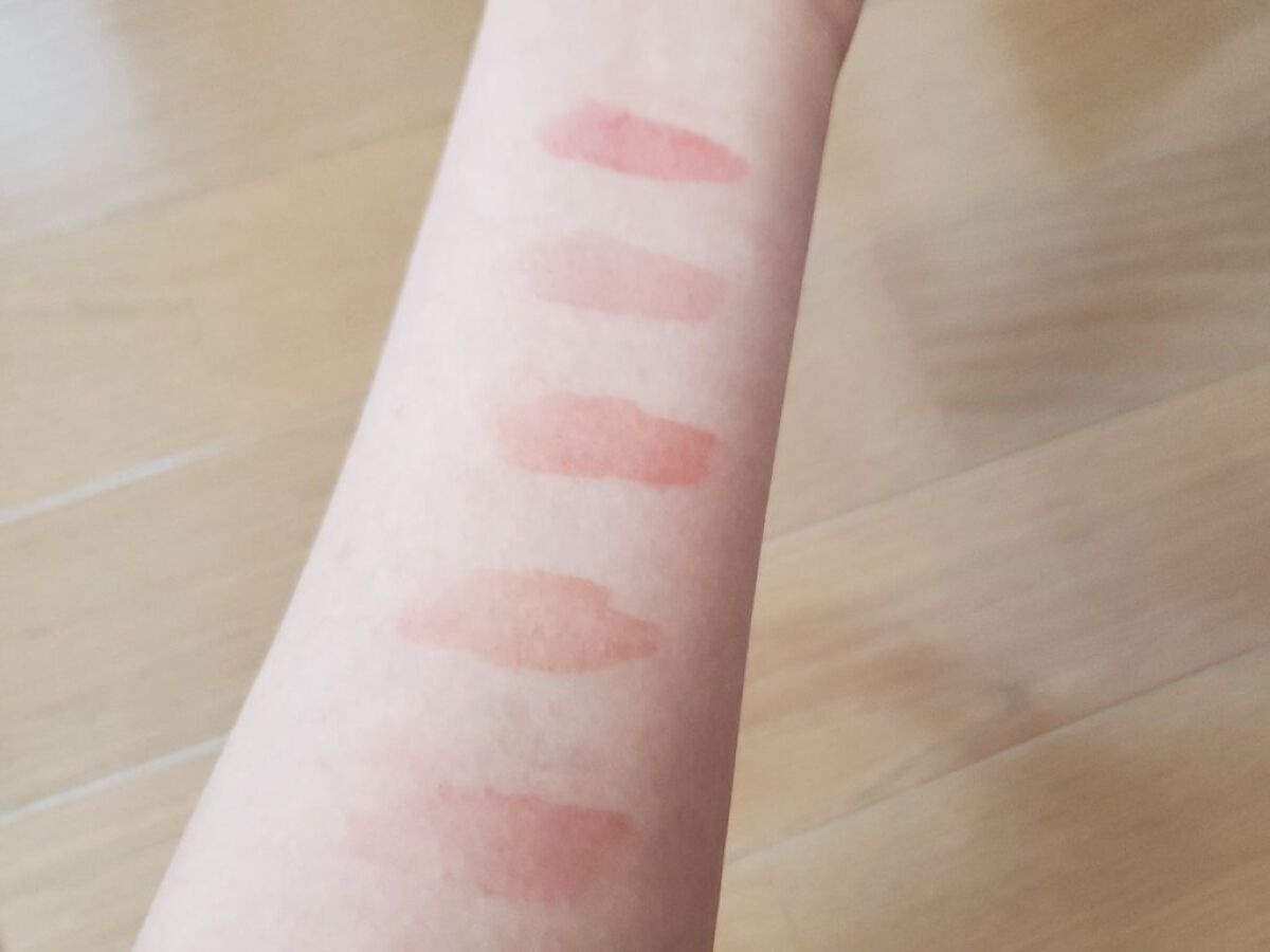 - <ピュアコーラル> 水、トリメチルシロキシフェニルジメチコン、オクチルドデカノール、ダイマージリノール酸ダイマージリノレイルビス(ベヘニル/イソステアリル/フィトステリル)、ポリアミド-8、リンゴ酸ジイソステアリル、ポリソルベート60、BG、セタノール、グリセリン、セスキオレイン酸ソルビタン、変性アルコール、(アクリル酸ヒドロキシエチル/アクリロイルジメチルタウリンNa)コポリマー、ヨーロッパキイチゴ葉エキス、(カプリル酸/カプリン酸)ヤシアルキル、加水分解ヒアルロン酸、(ヒマシ油/IPDI)コポリマー、(カプリル酸/カプリン酸/コハク酸)トリグリセリル、エチルヘキシルグリセリン、トリ(カプリル酸/カプリン酸)グリセリル、カプリリルグリコール、1,2-ヘキサンジオール、トコフェロール、ポリアクリレート-13、ポリイソブテン、テトラ(ジ-t-ブチルヒドロキシヒドロケイヒ酸)ペンタエリスリチル、イソステアリン酸ソルビタン、ポリソルベート20、デヒドロ酢酸、フィチン酸Na、香料、酸化チタン、黄5、赤227、青1 <メロウピンク> 水、トリメチルシロキシフェニルジメチコン、オクチルドデカノール、ダイマージリノール酸ダイマージリノレイルビス(ベヘニル/イソステアリル/フィトステリル)、ポリアミド-8、リンゴ酸ジイソステアリル、ポリソルベート60、BG、セタノール、グリセリン、セスキオレイン酸ソルビタン、変性アルコール、(アクリル酸ヒドロキシエチル/アクリロイルジメチルタウリンNa)コポリマー、ヨーロッパキイチゴ葉エキス、(カプリル酸/カプリン酸)ヤシアルキル、加水分解ヒアルロン酸、(ヒマシ油/IPDI)コポリマー、(カプリル酸/カプリン酸/コハク酸)トリグリセリル、エチルヘキシルグリセリン、トリ(カプリル酸/カプリン酸)グリセリル、カプリリルグリコール、1,2-ヘキサンジオール、トコフェロール、ポリアクリレート-13、ポリイソブテン、テトラ(ジ-t-ブチルヒドロキシヒドロケイヒ酸)ペンタエリスリチル、イソステアリン酸ソルビタン、ポリソルベート20、デヒドロ酢酸、フィチン酸Na、香料、酸化チタン、黄5、赤227、青1 <デューイーフィグ> 水、トリメチルシロキシフェニルジメチコン、オクチルドデカノール、ダイマージリノール酸ダイマージリノレイルビス(ベヘニル/イソステアリル/フィトステリル)、ポリアミド-8、リンゴ酸ジイソステアリル、ポリソルベート60、BG、セタノール、グリセリン、セスキオレイン酸ソルビタン、変性アルコール、(アクリル酸ヒドロキシエチル/アクリロイルジメチルタウリンNa)コポリマー、ヨーロッパキイチゴ葉エキス、(カプリル酸/カプリン酸)ヤシアルキル、加水分解ヒアルロン酸、(ヒマシ油/IPDI)コポリマー、(カプリル酸/カプリン酸/コハク酸)トリグリセリル、エチルヘキシルグリセリン、トリ(カプリル酸/カプリン酸)グリセリル、カプリリルグリコール、1,2-ヘキサンジオール、トコフェロール、ポリアクリレート-13、ポリイソブテン、テトラ(ジ-t-ブチルヒドロキシヒドロケイヒ酸)ペンタエリスリチル、イソステアリン酸ソルビタン、ポリソルベート20、デヒドロ酢酸、フィチン酸Na、香料、酸化チタン、黄5、赤227、青1 <チリングレッド> 水、トリメチルシロキシフェニルジメチコン、オクチルドデカノール、ダイマージリノール酸ダイマージリノレイルビス(ベヘニル/イソステアリル/フィトステリル)、ポリアミド-8、リンゴ酸ジイソステアリル、ポリソルベート60、BG、セタノール、グリセリン、セスキオレイン酸ソルビタン、変性アルコール、(アクリル酸ヒドロキシエチル/アクリロイルジメチルタウリンNa)コポリマー、ヨーロッパキイチゴ葉エキス、(カプリル酸/カプリン酸)ヤシアルキル、加水分解ヒアルロン酸、(ヒマシ油/IPDI)コポリマー、(カプリル酸/カプリン酸/コハク酸)トリグリセリル、エチルヘキシルグリセリン、トリ(カプリル酸/カプリン酸)グリセリル、カプリリルグリコール、1,2-ヘキサンジオール、トコフェロール、ポリアクリレート-13、ポリイソブテン、テトラ(ジ-t-ブチルヒドロキシヒドロケイヒ酸)ペンタエリスリチル、イソステアリン酸ソルビタン、ポリソルベート20、デヒドロ酢酸、フィチン酸Na、香料、黄5、赤227、青1 <モーヴメント> 水、トリメチルシロキシフェニルジメチコン、オクチルドデカノール、ダイマージリノール酸ダイマージリノレイルビス(ベヘニル/イソステアリル/フィトステリル)、ポリアミド-8、リンゴ酸ジイソステアリル、ポリソルベート60、BG、セタノール、グリセリン、セスキオレイン酸ソルビタン、変性アルコール、(アクリル酸ヒドロキシエチル/アクリロイルジメチルタウリンNa)コポリマー、ヨーロッパキイチゴ葉エキス、(カプリル酸/カプリン酸)ヤシアルキル、加水分解ヒアルロン酸、(ヒマシ油/IPDI)コポリマー、(カプリル酸/カプリン酸/コハク酸)トリグリセリル、エチルヘキシルグリセリン、トリ(カプリル酸/カプリン酸)グリセリル、カプリリルグリコール、1,2-ヘキサンジオール、トコフェロ