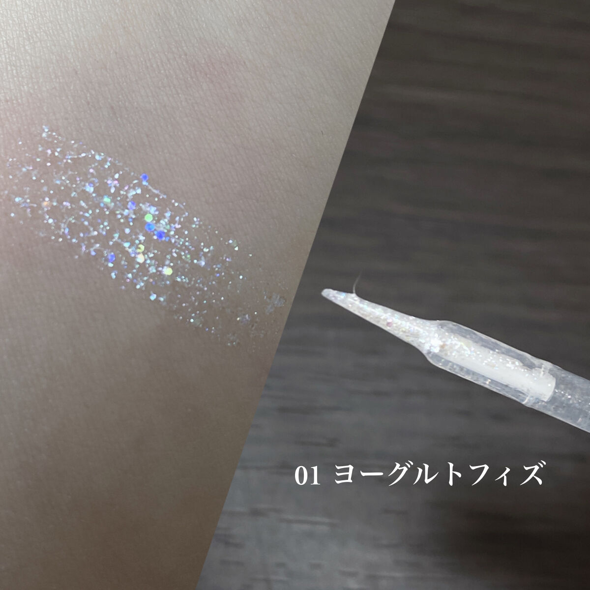 - 大粒すぎないから使いやすい! 高輝度ラメたっぷりのカラフルグリッター ラメの粒子サイズを大きくしすぎないことで、 悪目立ちしない絶妙な輝きに仕上げました。 ベース液にパールを多めに配合しているため、 サラッと控えめに塗ってもしっかり輝きます! やわらかく使い勝手の良い極細筆で、狙ったところにラメをオン! ☆使い方☆ 下まつげのキワに沿って 本品で細くアイラインを引くと、 オーロラに輝く印象的な目元の完成!