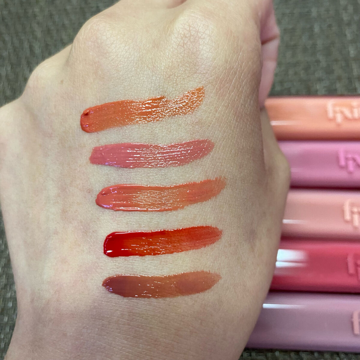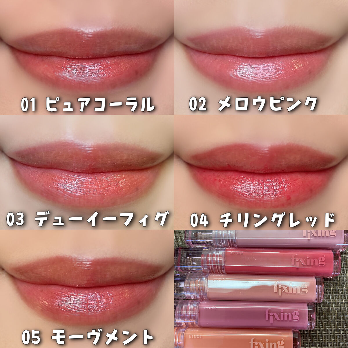 - <ピュアコーラル> 水、トリメチルシロキシフェニルジメチコン、オクチルドデカノール、ダイマージリノール酸ダイマージリノレイルビス(ベヘニル/イソステアリル/フィトステリル)、ポリアミド-8、リンゴ酸ジイソステアリル、ポリソルベート60、BG、セタノール、グリセリン、セスキオレイン酸ソルビタン、変性アルコール、(アクリル酸ヒドロキシエチル/アクリロイルジメチルタウリンNa)コポリマー、ヨーロッパキイチゴ葉エキス、(カプリル酸/カプリン酸)ヤシアルキル、加水分解ヒアルロン酸、(ヒマシ油/IPDI)コポリマー、(カプリル酸/カプリン酸/コハク酸)トリグリセリル、エチルヘキシルグリセリン、トリ(カプリル酸/カプリン酸)グリセリル、カプリリルグリコール、1,2-ヘキサンジオール、トコフェロール、ポリアクリレート-13、ポリイソブテン、テトラ(ジ-t-ブチルヒドロキシヒドロケイヒ酸)ペンタエリスリチル、イソステアリン酸ソルビタン、ポリソルベート20、デヒドロ酢酸、フィチン酸Na、香料、酸化チタン、黄5、赤227、青1 <メロウピンク> 水、トリメチルシロキシフェニルジメチコン、オクチルドデカノール、ダイマージリノール酸ダイマージリノレイルビス(ベヘニル/イソステアリル/フィトステリル)、ポリアミド-8、リンゴ酸ジイソステアリル、ポリソルベート60、BG、セタノール、グリセリン、セスキオレイン酸ソルビタン、変性アルコール、(アクリル酸ヒドロキシエチル/アクリロイルジメチルタウリンNa)コポリマー、ヨーロッパキイチゴ葉エキス、(カプリル酸/カプリン酸)ヤシアルキル、加水分解ヒアルロン酸、(ヒマシ油/IPDI)コポリマー、(カプリル酸/カプリン酸/コハク酸)トリグリセリル、エチルヘキシルグリセリン、トリ(カプリル酸/カプリン酸)グリセリル、カプリリルグリコール、1,2-ヘキサンジオール、トコフェロール、ポリアクリレート-13、ポリイソブテン、テトラ(ジ-t-ブチルヒドロキシヒドロケイヒ酸)ペンタエリスリチル、イソステアリン酸ソルビタン、ポリソルベート20、デヒドロ酢酸、フィチン酸Na、香料、酸化チタン、黄5、赤227、青1 <デューイーフィグ> 水、トリメチルシロキシフェニルジメチコン、オクチルドデカノール、ダイマージリノール酸ダイマージリノレイルビス(ベヘニル/イソステアリル/フィトステリル)、ポリアミド-8、リンゴ酸ジイソステアリル、ポリソルベート60、BG、セタノール、グリセリン、セスキオレイン酸ソルビタン、変性アルコール、(アクリル酸ヒドロキシエチル/アクリロイルジメチルタウリンNa)コポリマー、ヨーロッパキイチゴ葉エキス、(カプリル酸/カプリン酸)ヤシアルキル、加水分解ヒアルロン酸、(ヒマシ油/IPDI)コポリマー、(カプリル酸/カプリン酸/コハク酸)トリグリセリル、エチルヘキシルグリセリン、トリ(カプリル酸/カプリン酸)グリセリル、カプリリルグリコール、1,2-ヘキサンジオール、トコフェロール、ポリアクリレート-13、ポリイソブテン、テトラ(ジ-t-ブチルヒドロキシヒドロケイヒ酸)ペンタエリスリチル、イソステアリン酸ソルビタン、ポリソルベート20、デヒドロ酢酸、フィチン酸Na、香料、酸化チタン、黄5、赤227、青1 <チリングレッド> 水、トリメチルシロキシフェニルジメチコン、オクチルドデカノール、ダイマージリノール酸ダイマージリノレイルビス(ベヘニル/イソステアリル/フィトステリル)、ポリアミド-8、リンゴ酸ジイソステアリル、ポリソルベート60、BG、セタノール、グリセリン、セスキオレイン酸ソルビタン、変性アルコール、(アクリル酸ヒドロキシエチル/アクリロイルジメチルタウリンNa)コポリマー、ヨーロッパキイチゴ葉エキス、(カプリル酸/カプリン酸)ヤシアルキル、加水分解ヒアルロン酸、(ヒマシ油/IPDI)コポリマー、(カプリル酸/カプリン酸/コハク酸)トリグリセリル、エチルヘキシルグリセリン、トリ(カプリル酸/カプリン酸)グリセリル、カプリリルグリコール、1,2-ヘキサンジオール、トコフェロール、ポリアクリレート-13、ポリイソブテン、テトラ(ジ-t-ブチルヒドロキシヒドロケイヒ酸)ペンタエリスリチル、イソステアリン酸ソルビタン、ポリソルベート20、デヒドロ酢酸、フィチン酸Na、香料、黄5、赤227、青1 <モーヴメント> 水、トリメチルシロキシフェニルジメチコン、オクチルドデカノール、ダイマージリノール酸ダイマージリノレイルビス(ベヘニル/イソステアリル/フィトステリル)、ポリアミド-8、リンゴ酸ジイソステアリル、ポリソルベート60、BG、セタノール、グリセリン、セスキオレイン酸ソルビタン、変性アルコール、(アクリル酸ヒドロキシエチル/アクリロイルジメチルタウリンNa)コポリマー、ヨーロッパキイチゴ葉エキス、(カプリル酸/カプリン酸)ヤシアルキル、加水分解ヒアルロン酸、(ヒマシ油/IPDI)コポリマー、(カプリル酸/カプリン酸/コハク酸)トリグリセリル、エチルヘキシルグリセリン、トリ(カプリル酸/カプリン酸)グリセリル、カプリリルグリコール、1,2-ヘキサンジオール、トコフェロ