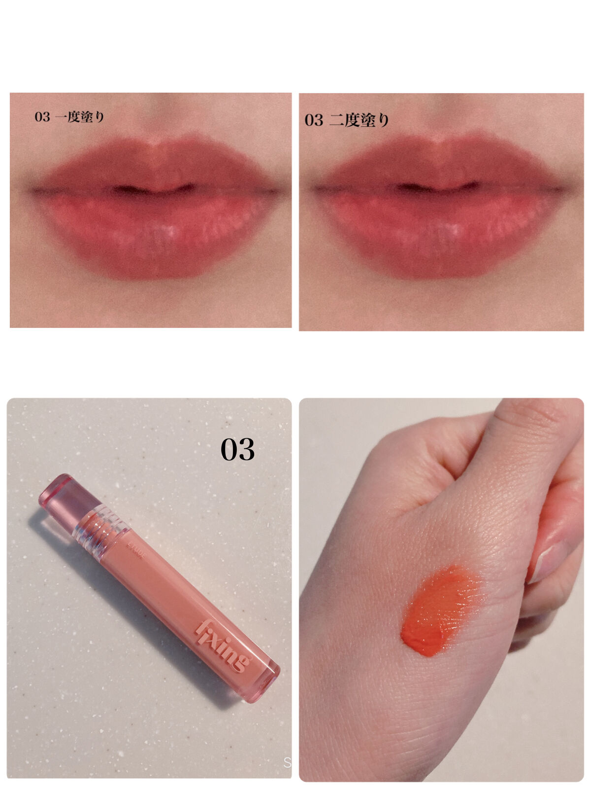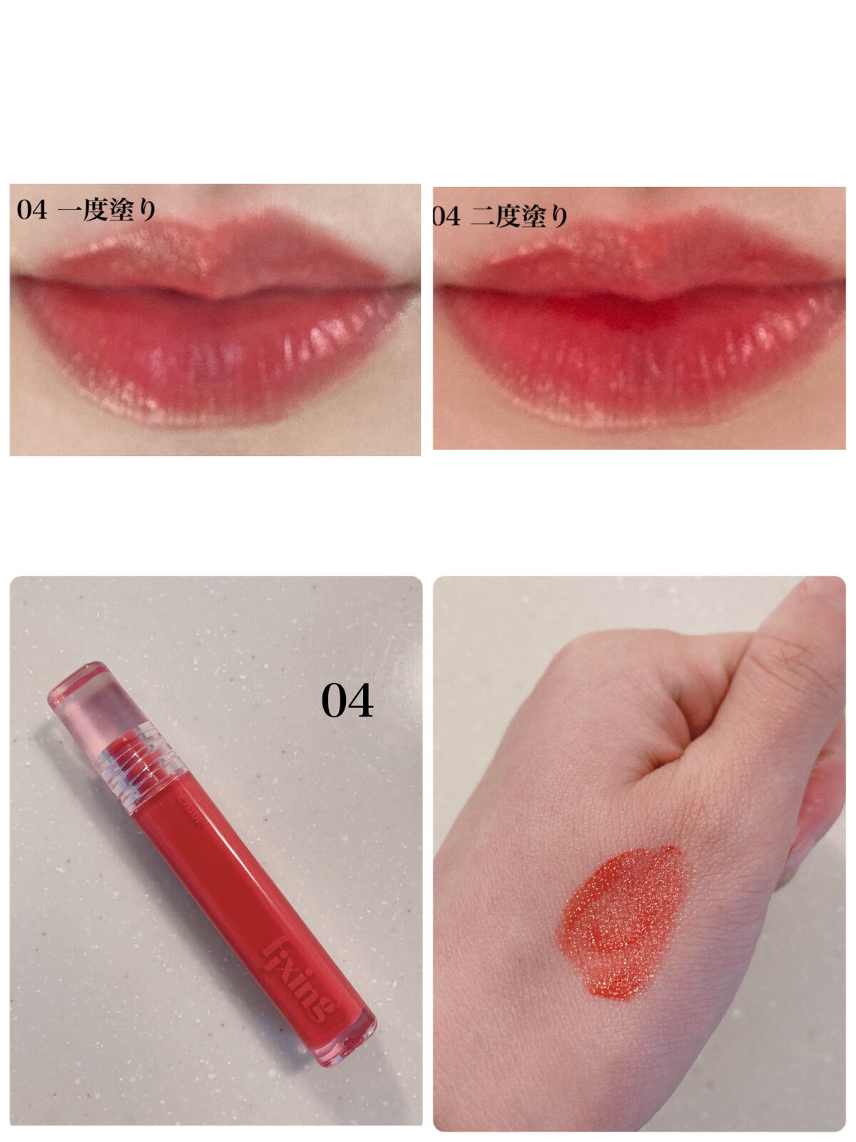 グロウ フィクシングティントは、全体的にブルベ寄りのカラーが多いのかな?とも思ったのですが、透明感があって自然に唇に馴染むので、イエベの私でも全色使いやすいっ🤍 イエベが敬遠しがちな青みピンクの02メロウピンクも、時間が経つと馴染んで良い感じに✨ 01ピュアコーラル/03デューイーフィグ/04チリングレッドに関しては、イエベさんに全力で推したい🙌! このリップの楽しいところは、重ね塗りをすることで違った表情が楽しめるところ🤍 透明感のあるカラーがフィックスし、濃淡のある発色を楽しめます💐 色持ちも良く、乾燥もしづらかったです!全色とっても気に入りました🤍気になっている方、ぜひ試してみてくださいね✨