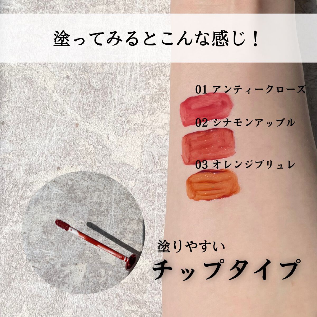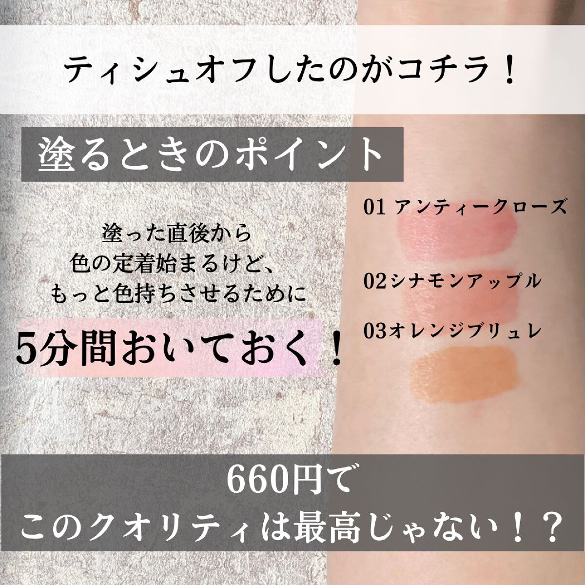 - ツヤ膜でLIPカラーを閉じ込める 塗ってから「5分」でかわいい唇完成♥ツヤがあふれ出るオイルinウォーターティント 水に対して約2倍のオイル成分を配合した「オイルinウォーター処方」 時間経過でツヤ膜がじゅわ~っとあふれ出し、 まるでグロスを重ねたような仕上がりに。みずみずしいツヤ感が持続します。 塗布後、時間経過(※)で色が定着して食べても飲んでも血色長持ち。 (※定着には個人差があります。弊社5分推奨) 高密着で唇に溶け込むように色づきます。 コップやペットボトルへの色移りがしにくくなります。