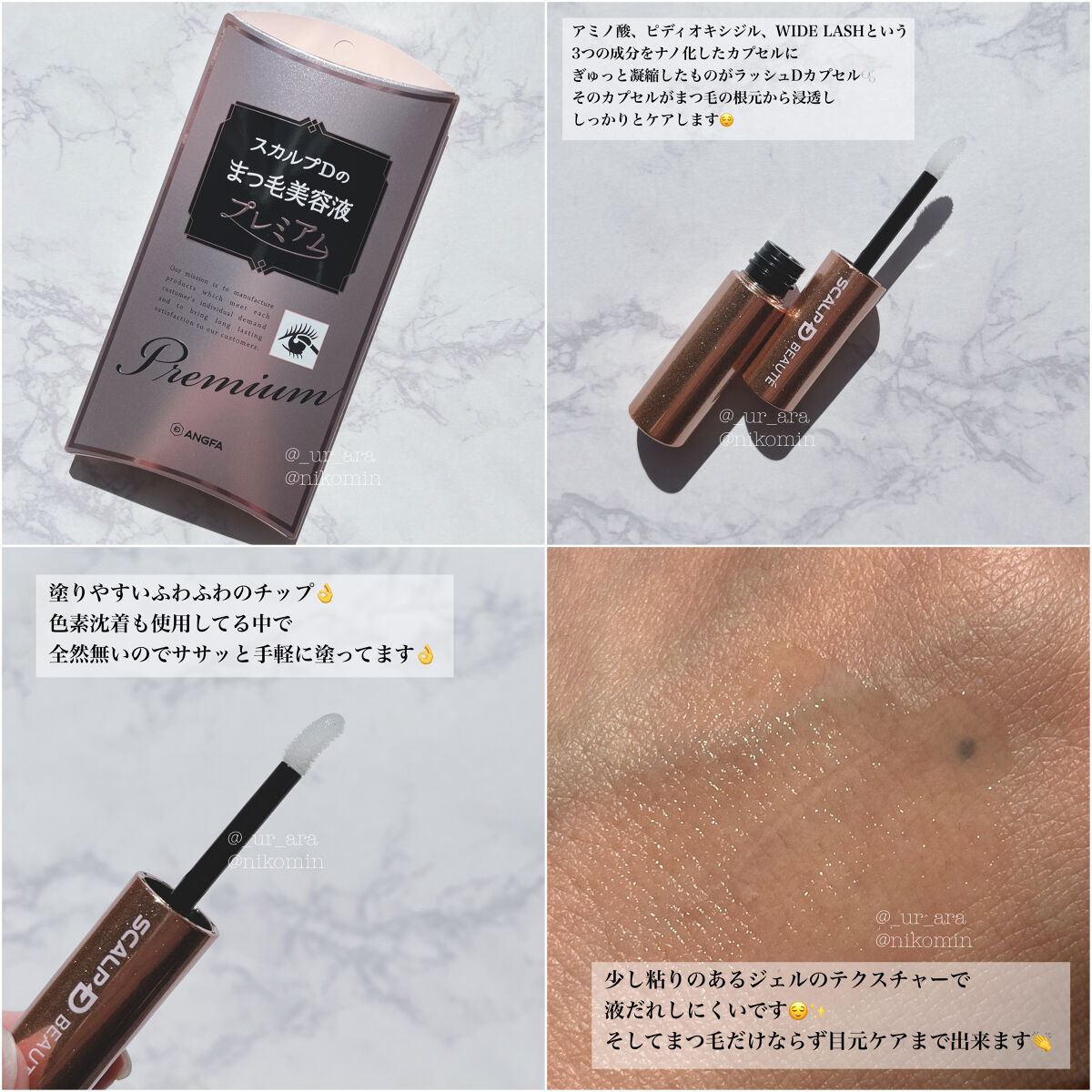 - スカルプDのまつ毛美容液プレミアムは、まつ毛ケア成分を通常品の2倍配合しており、1日1回のケアでもOK♪ さらに、プレミアムには、目元ケア成分配合。まつ毛のハリコシがアップし、上向きカールまつ毛をぐ~んとキープ♪ 使いやすさ・やさしさにこだわった、ふわふわカールチップ採用で根元からも塗りやすく、敏感な目元にやさしい使い心地です。 シリコン、オイル、アルコール(エタノール)、防腐剤(パラベン)、香料、合成着色料、界面活性剤、プロスタグランジン類似物質の8つの成分不使用の“ピュアフリー設計”を実現。 まつ毛エクステ、まつ毛パーマにもご使用いただけます。