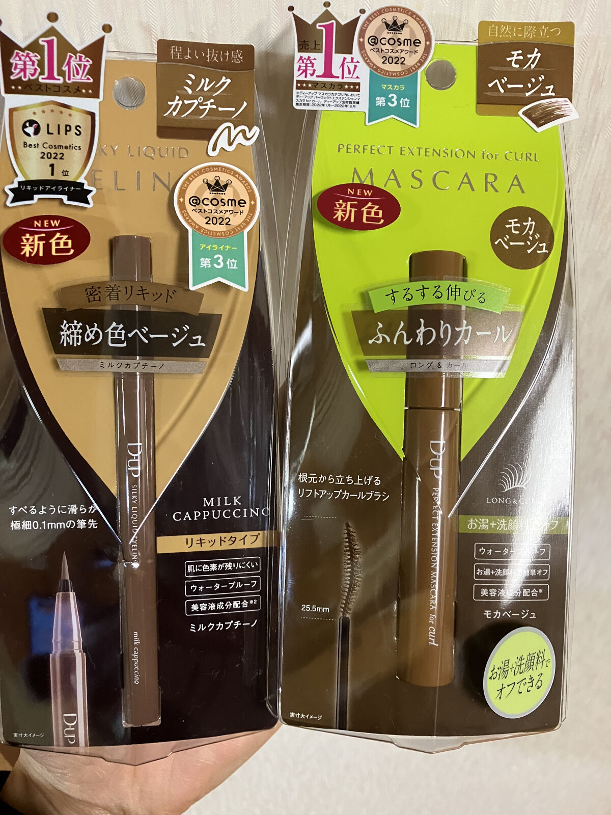 パーフェクトエクステンションマスカラ for カール マスカラ新色 『モカベージュ』 小さめブラシで小回り◎+カールブラシが目のカーブにフィットして塗りやすい🥰 シルキーリキッドアイライナー アイライナー新色 『ミルクカプチーノ』 目尻までかすれず滑らかに理想のラインが描けて、長時間キープ😘 王道ブラウンよりも、柔らかな存在感 やわらかい雰囲気を作りたいときはこれ😍