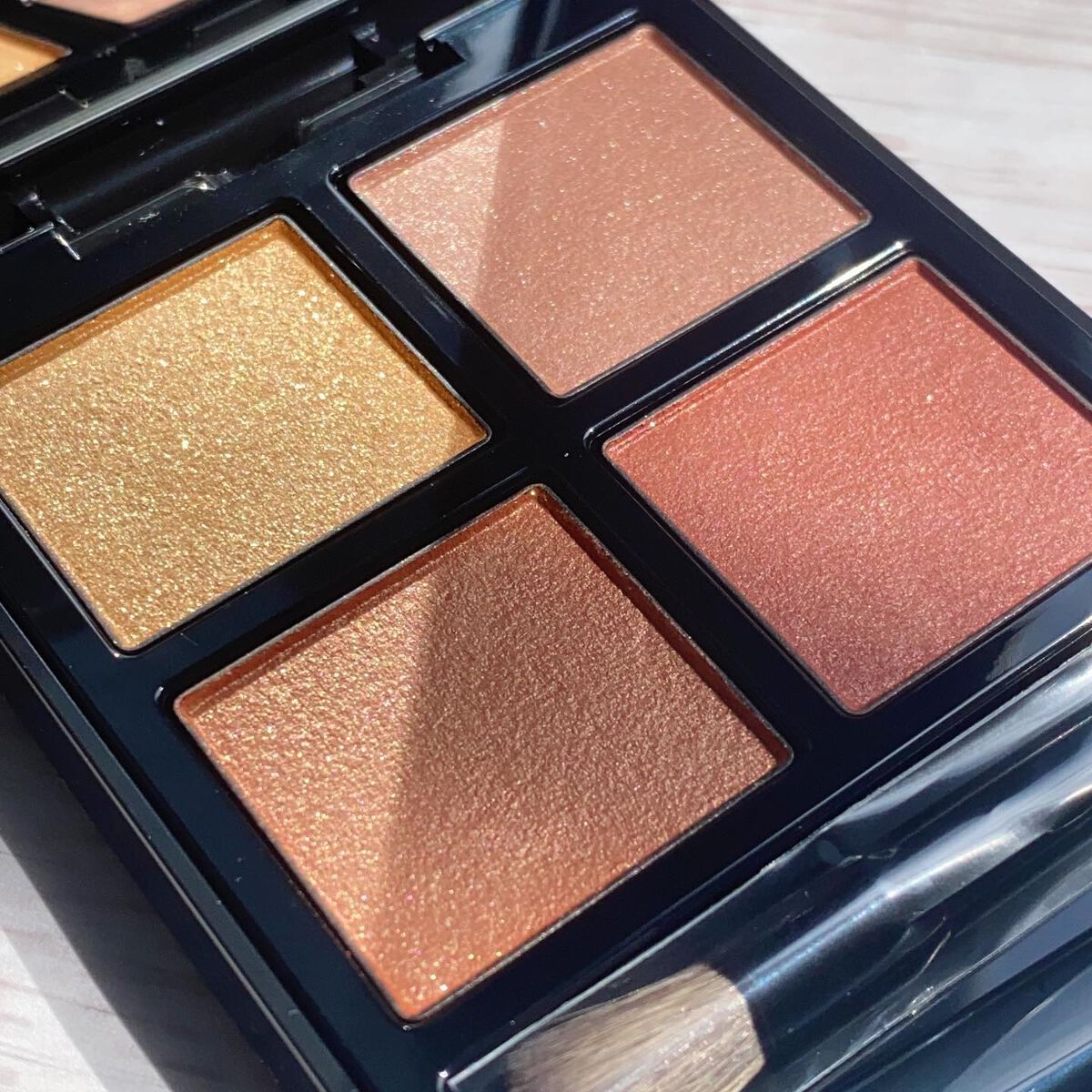 柔らかでしっとりした粉質で発色も優しめでぼかしやすい✍️ 真ん中のロゴの部分のラメが輝度高めで粒もしっかりしてるのに、ザラザラせず密着力が良い✨✨ ロゴ以外の部分も細やかなパールが各部分に特徴的に潜んでて、色んなシーンで使えそう💫 ただローズマリーとラベンダーの香りかな? 少し独特な香りがして、写真撮ってる時やスウォッチ撮ってる時に長めにパレットを開けてると香りがキツく感じてしまった🥲 色使いというか暗めのしっかりした締め色がないのも、すごく今どきなパレットだなと思ったよ✍️ だからどれを肌に載せても主役になるし、捨て色はないから、幅広いシーンに使えるなぁと思ったよ! こういう色使いだからこそ、大人の女性たちにも使ってもらいたいって思えるアイシャドウだった💗