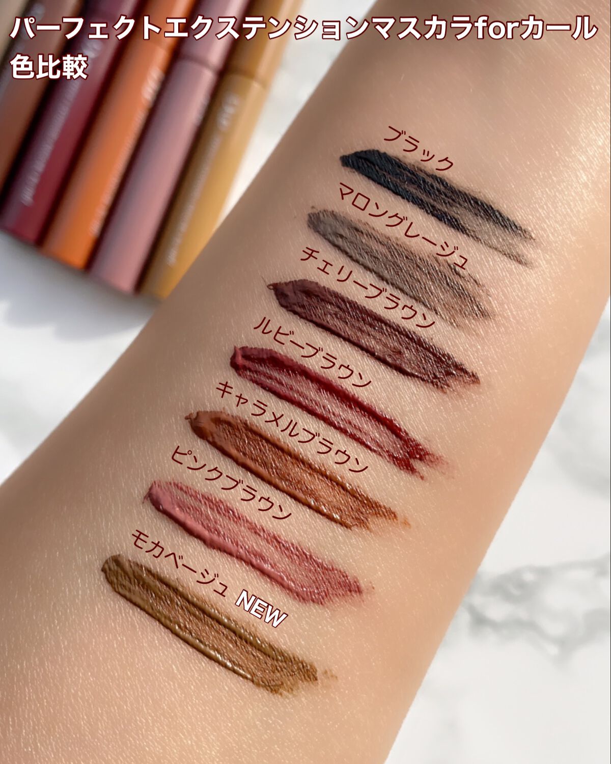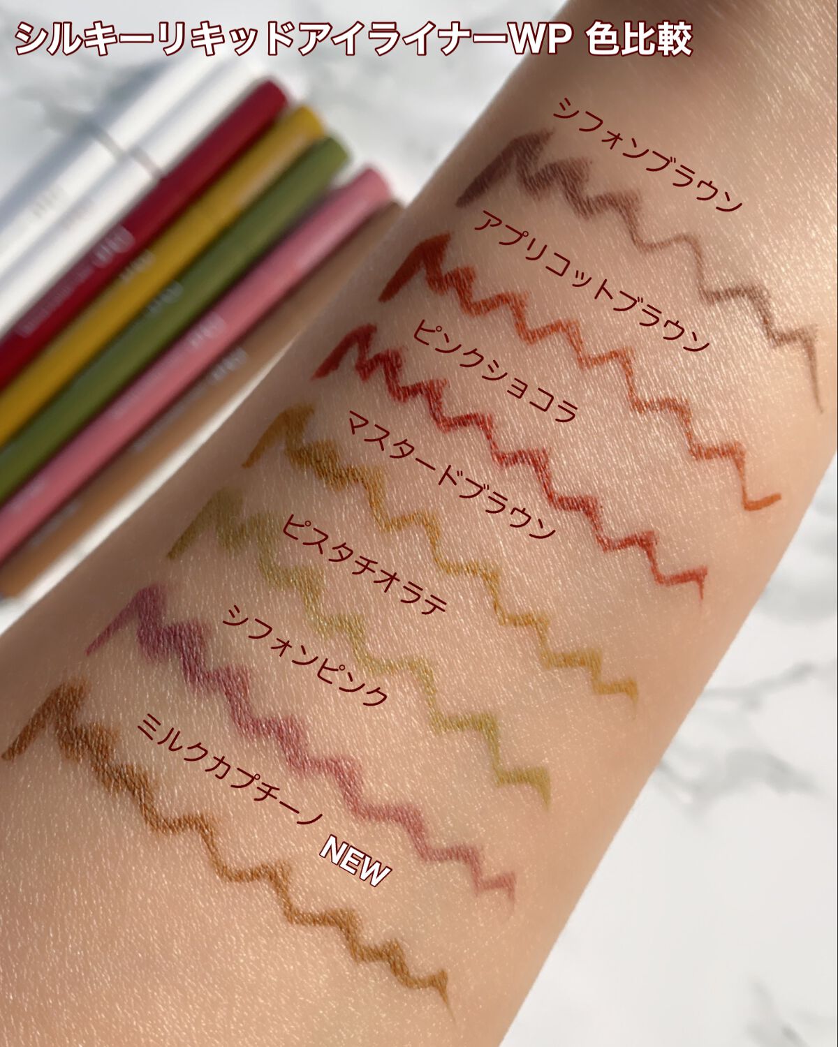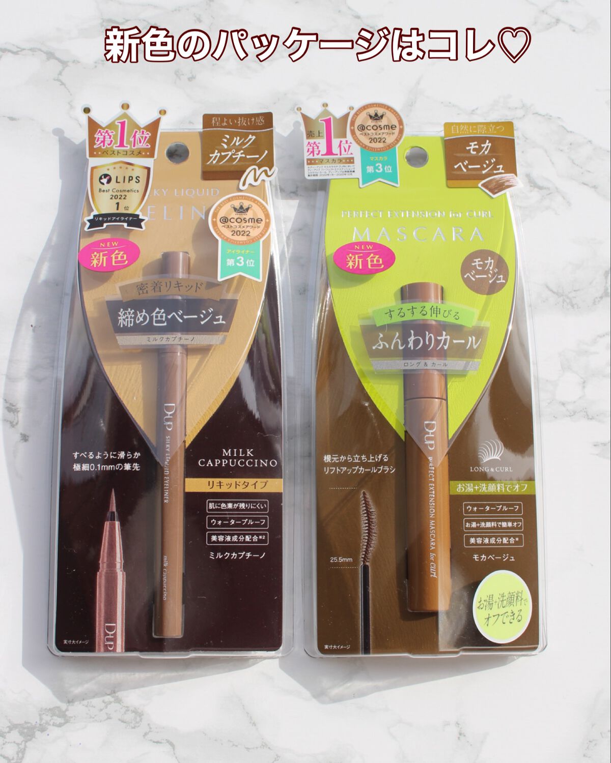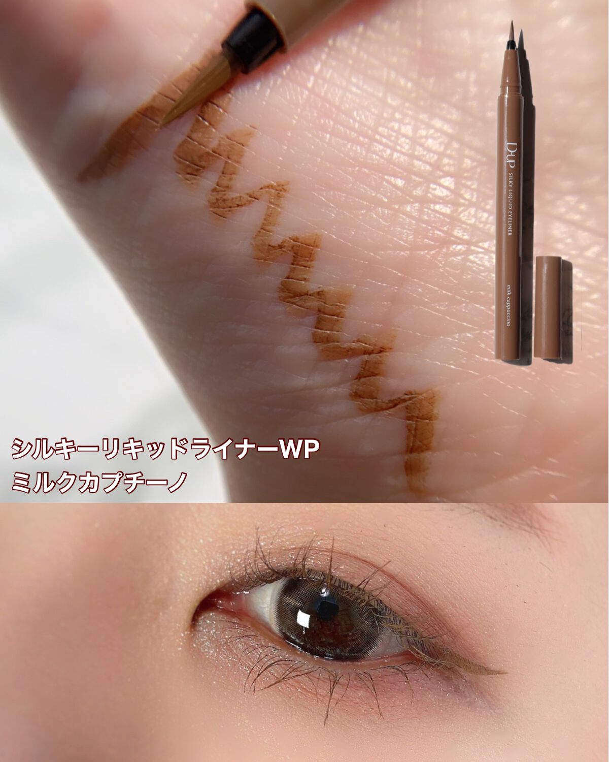 パーフェクトエクステンションマスカラ for カール マスカラ新色 『モカベージュ』 小さめブラシで小回り◎+カールブラシが目のカーブにフィットして塗りやすい🥰 シルキーリキッドアイライナー アイライナー新色 『ミルクカプチーノ』 目尻までかすれず滑らかに理想のラインが描けて、長時間キープ😘 王道ブラウンよりも、柔らかな存在感 やわらかい雰囲気を作りたいときはこれ😍