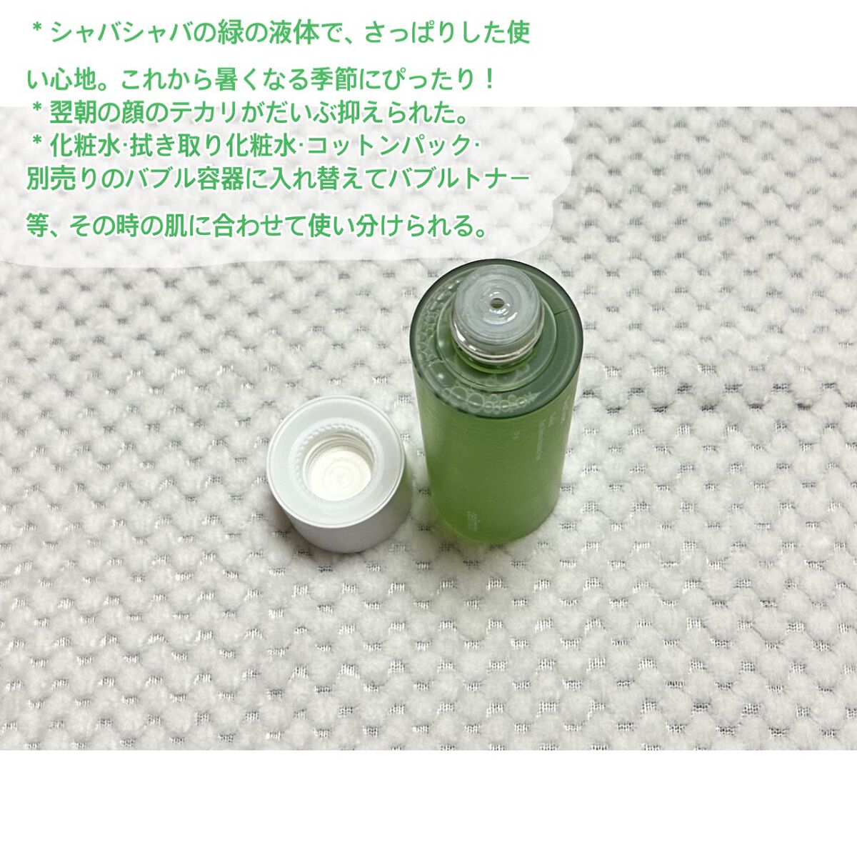 *価格:390円,1290円,1990円(税込) *内容量:50ml,200ml,400ml *リフィルは200mlで、990円(税込) *付け替えたトリガー部分の価格は、250円(税込) *洗顔後、化粧水前に使用する *天然うるおい成分のツバキ種子エキス、ミツバアケビ茎エキス、ジャノヒゲ根エキス、コメヌカエキス、スベリヒユエキス、アンズ果汁を配合 *無香料、無鉱物油、無着色、弱酸性、パラベンフリー、アルコールフリー *サラッとしていて、水のような感じ *香りは特になく、誰でも好き嫌いなく使えそう *化粧水の浸透が良くなった気がする *トリガータイプのヘッドに変えたことによって、洗顔後の顔の水分が奪われる前に吹きかけられる