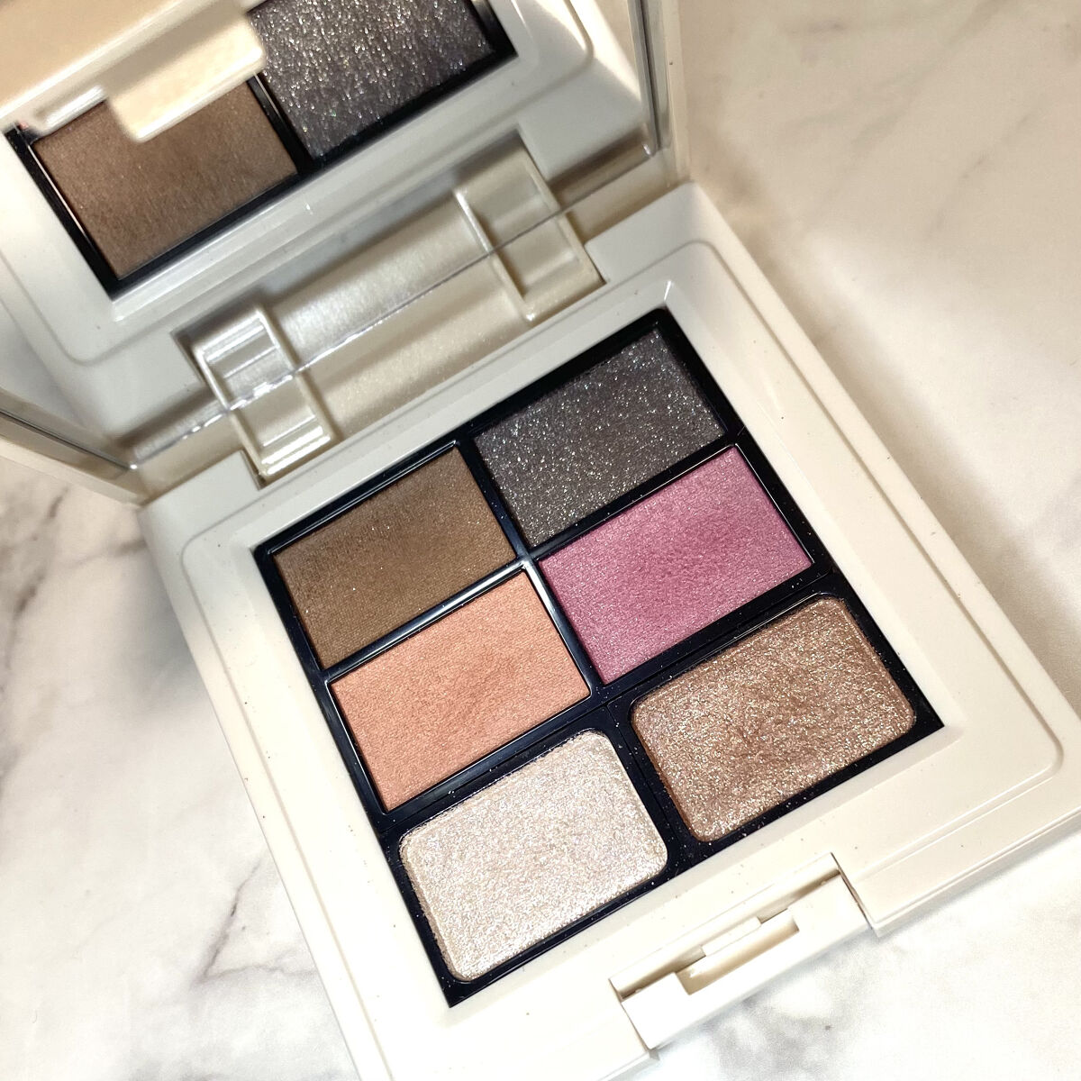 モーブカラーとラメとでとっても可愛いアイシャドウです! 左上はラメカラー。 ゴールド系のツヤっとしたラメで華やかな印象! 右上はシアーなピンク。 しっとりとした粉質の柔らかい青みピンクです! 左下はマットなモーブピンク。 しっかり発色するモーブカラー! 右下はモーブ系のラメカラー。 ぶどうのような色味にラメがぎっしりと! どの色味をメインに使うかによってメイクの雰囲気も大きく変わります🙆🏻♀️ どの色味も共通してしっとりとした粉質です! 石鹸落ちなので、持ちが抜群かと聞かれたらそうではないですが 普段使いでヨレなどが気になることはありません🪞