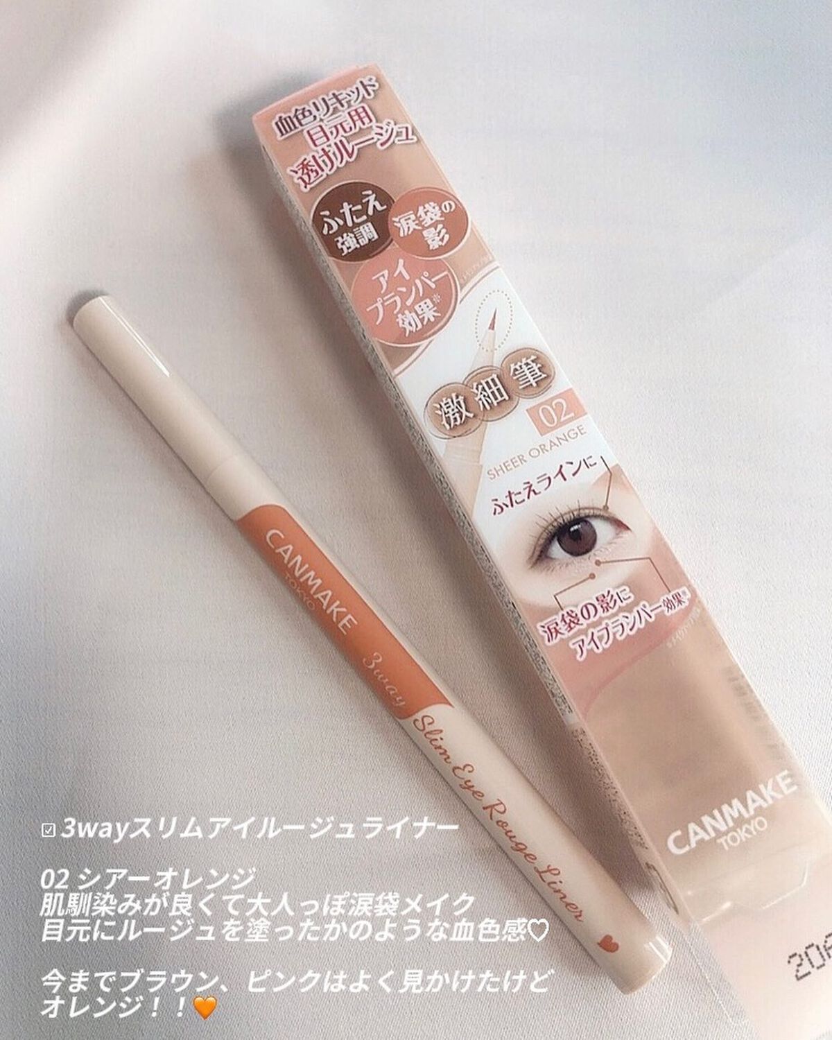☆MimiBeautyのイベントでいただきました。超自然な涙袋メイクができるピーチピンクコンシーラー!CANMAKEアイバックコンシーラー03ピーチオレンジナチュラルにぷっくり*涙袋メイクを作る3mmの細芯コンシーラー!☑️なめらかな描き心地...