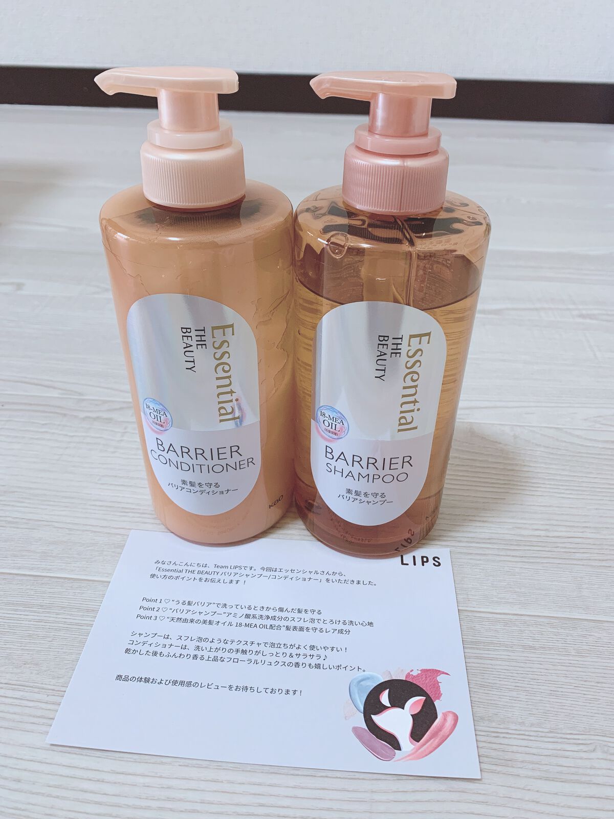 エッセンシャルプレミアムバリアシャンプー・コンディショナーシルキー&スムース〈説明〉・シャンプー・コンディショナー・450ml(両方とも)〈感想〉ホワイトピーチ&ムスクの香りは良い匂いで良かったです。シャンプーの洗浄力には私的には満足しました...