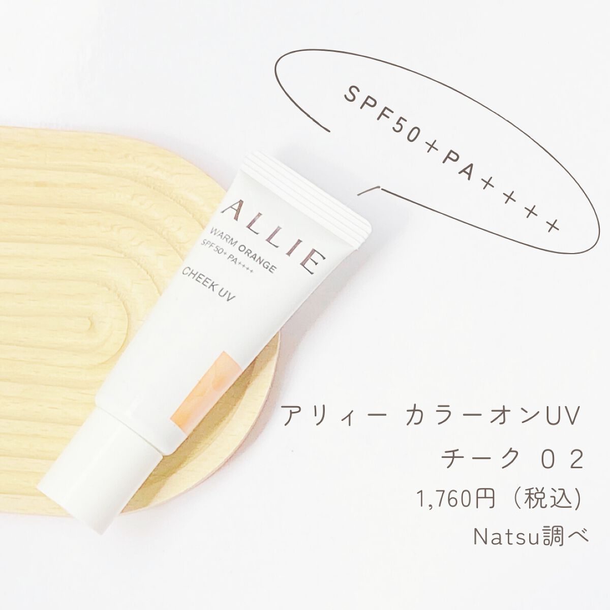 - ◆紫外線を浴びやすい、頬に使えるチークUV/鼻・頬に使える追いツヤUV ◆メイクの上から塗り直しとしても使える。 ◆汗・皮脂 マスクやタオルなどのこすれにも強く落ちにくい。 ◆「カラーUVヴェール技術」で、ベースメイクと混ざりにくく均一に密着。 SPF50+と感触の良さはそのままに素肌を活かした自然な色づきを両立! ◆8時間色持ち データ取得済み ※アリィー調べ。効果には個人差があります。 <基本情報> ・強力UV カット(SPF50+・PA++++) ・フリクションプルーフ:タオルやマスク等のこすれにも強く、落ちにくい ・スーパーウォータープルーフ:汗・水に抜群※²に強い機能 ※² アリィー商品内において LUCENT PINK(チーク 01) 自然に色づき血色感仕上がりの‟透け感ピンク” パッケージもピンクで、ポーチの中も華やぐメイクアイテムです WARM ORANGE(チーク 02) ヘルシーな血色感仕上げの‟じんわりオレンジ” じんわ~りと血色感を与えてくれるから、素肌を活かした自然な仕上がりに TRANSLUCENT(ラスター) ツヤ感を演出する‟シマーカラー” 鼻や頬にハイライトとして使うことで長時間ツヤが持続します