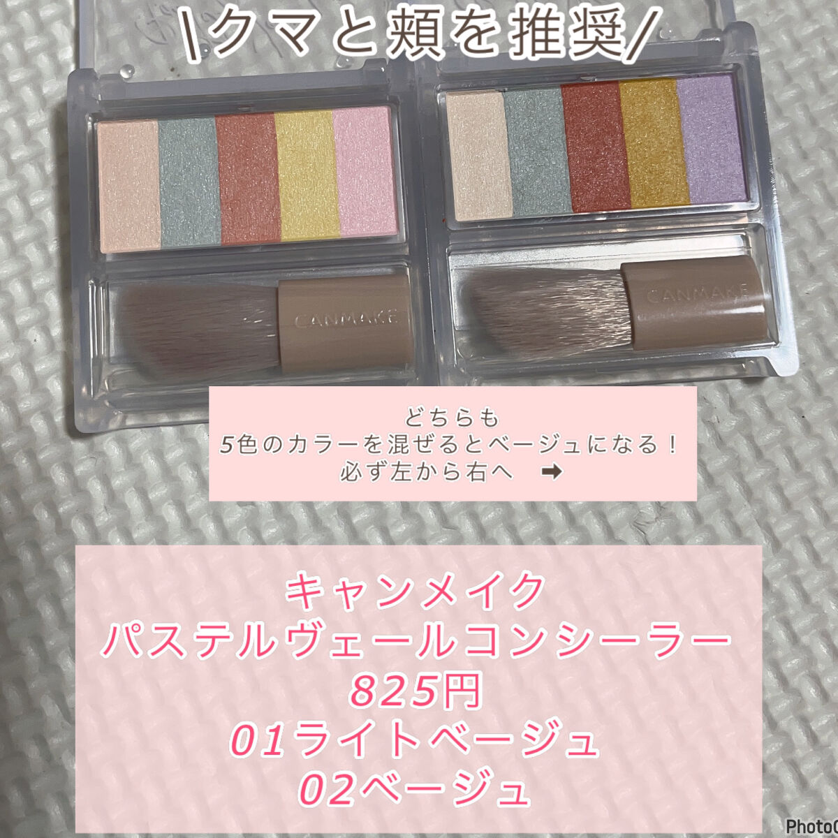 キャンメイク パステルヴェールコンシーラー02 ベージュめるで素肌クマ、頬パウダーコンシーラーカラーでふわっとぼかす混ぜるとベージュベースメイクの最後に使用します。左から順番に2〜3回ブラシを滑らせる。クマや頬の上にふわっと重ねる悩みによって...