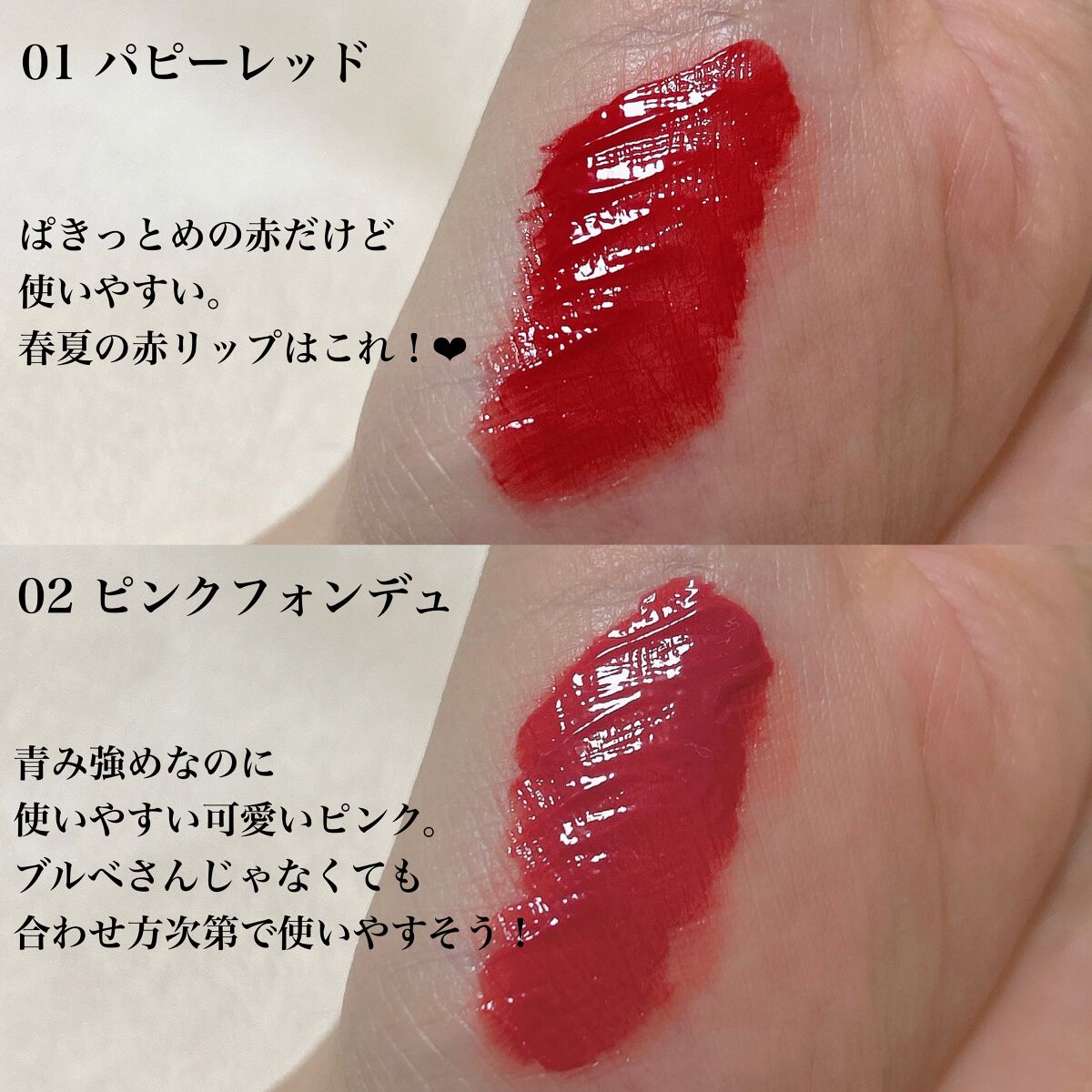 - <01 パピーレッド> 水、ダイマージリノール酸ダイマージリノレイル、ジフェニルジメチコン、ジフェニルシロキシフェニルトリメチコン、オクチルドデカノール、トリイソステアリン酸ポリグリセリルー2、ラウロイルグルタミン酸ジ(フィトステリル/オクチルドデシル)、ダイマージリノール酸(フィトステリル/イソステアリル/セチル/ステアリル/ベヘニル)、BG、水添ポリイソブテン、グリセリン、セテスー10、エタノール、セチルPEG/PPGー10/1ジメチコン、(アクリル酸ヒドロキシエチル/アクリロイルジメチルタウリンNa)コポリマー、イソヘキサデカン、フェノキシエタノール、メチルパラベン、ポリソルベート60、トコフェロール、エチルパラベン、デヒドロ酢酸Na、リン酸2Na、リン酸Na、シメチコン、シリカ、ハチミツ、スクワラン、ステアリン酸ソルビタン、ステアリン酸グリセリル、オレイン酸ポリグリセリルー10、セルロースガム、ヒアルロン酸Na、ローズマリー葉エキス、(+/ー)酸化鉄、酸化チタン、赤227、黄4、赤226、ポリアスパラギン酸Na、PVP、アクリレーツコポリマーアンモニウム、キサンタンガム、水酸化Al、EDTAー2Na <02 ピンクフォンデュ> 水、ダイマージリノール酸ダイマージリノレイル、ジフェニルジメチコン、ジフェニルシロキシフェニルトリメチコン、オクチルドデカノール、トリイソステアリン酸ポリグリセリルー2、ラウロイルグルタミン酸ジ(フィトステリル/オクチルドデシル)、ダイマージリノール酸(フィトステリル/イソステアリル/セチル/ステアリル/ベヘニル)、BG、水添ポリイソブテン、グリセリン、セテスー10、エタノール、セチルPEG/PPGー10/1ジメチコン、(アクリル酸ヒドロキシエチル/アクリロイルジメチルタウリンNa)コポリマー、イソヘキサデカン、フェノキシエタノール、メチルパラベン、ポリソルベート60、トコフェロール、エチルパラベン、デヒドロ酢酸Na、リン酸2Na、リン酸Na、シメチコン、シリカ、ハチミツ、スクワラン、ステアリン酸ソルビタン、ステアリン酸グリセリル、オレイン酸ポリグリセリルー10、セルロースガム、ヒアルロン酸Na、ローズマリー葉エキス、(+/ー)酸化鉄、酸化チタン、赤227、黄4、赤226、ポリアスパラギン酸Na、PVP、アクリレーツコポリマーアンモニウム、キサンタンガム、水酸化Al、EDTAー2Na <03 リッチグァバティー> 水、ダイマージリノール酸ダイマージリノレイル、ジフェニルジメチコン、グリセリン、ジフェニルシロキシフェニルトリメチコン、オクチルドデカノール、BG、トリイソステアリン酸ポリグリセリル-2、ダイマージリノール酸(フィトステリル/イソステアリル/セチル/ステアリル/ベヘニル)、セチルPEG/PPG-10/1ジメチコン、セテス-10、水添ポリイソブテン、ステアリン酸グリセリル(SE)、フェノキシエタノール、カルボマー、水酸化K、ステアロイルグルタミン酸Na、メチルパラベン、(アクリレーツ/アクリル酸アルキル(C10-30))クロスポリマー、トコフェロール、ポリソルベート80、ハチミツ、ヒアルロン酸Na、ローズマリー葉エキス、酸化チタン、酸化鉄、赤227、黄4、黄5、シリカ、水酸化Al、赤104(1)、青1 <04 オレンジアールグレイ> 水、ダイマージリノール酸ダイマージリノレイル、ジフェニルジメチコン、グリセリン、ジフェニルシロキシフェニルトリメチコン、オクチルドデカノール、BG、トリイソステアリン酸ポリグリセリル-2、ダイマージリノール酸(フィトステリル/イソステアリル/セチル/ステアリル/ベヘニル)、セチルPEG/PPG-10/1ジメチコン、セテス-10、水添ポリイソブテン、ステアリン酸グリセリル(SE)、フェノキシエタノール、カルボマー、水酸化K、ステアロイルグルタミン酸Na、メチルパラベン、(アクリレーツ/アクリル酸アルキル(C10-30))クロスポリマー、トコフェロール、ハチミツ、ヒアルロン酸Na、ローズマリー葉エキス、酸化鉄、黄4、赤227、黄5、シリカ <05 コンポートピンク> 水、ジフェニルジメチコン、ダイマージリノール酸ダイマージリノレイル、グリセリン、ジフェニルシロキシフェニルトリメチコン、オクチルドデカノール、BG、トリイソステアリン酸ポリグリセリル-2、ダイマージリノール酸(フィトステリル/イソステアリル/セチル/ステアリル/ベヘニル)、水添ポリイソブテン、セテス-10、セチルPEG/PPG-10/1ジメチコン、ステアリン酸グリセリル(SE)、フェノキシエタノール、カルボマー、水酸化K、ステアロイルグルタミン酸Na、(アクリレーツ/アクリル酸アルキル(C10-30))クロスポリマー、メチルパラベン、トコフェロール、ポリソルベート80、ハチミツ、ヒアルロン酸Na、ローズマリー葉エキス、(+/-)酸化チタン、酸化鉄、赤227、赤104(1)、黄4、黄5、シリカ、水酸化Al、青1 <06 ピンクマーガレット> 水、ジフェニルジメチコン、ダイマージリノール酸ダイマージリノレイル、グリセリン、ジフェニルシロキシフェニルトリメチコン、オクチルドデカノール、BG、トリイソステアリン酸ポリグリセリル-2、ダイマージリノール酸(フィトステリル/イソス