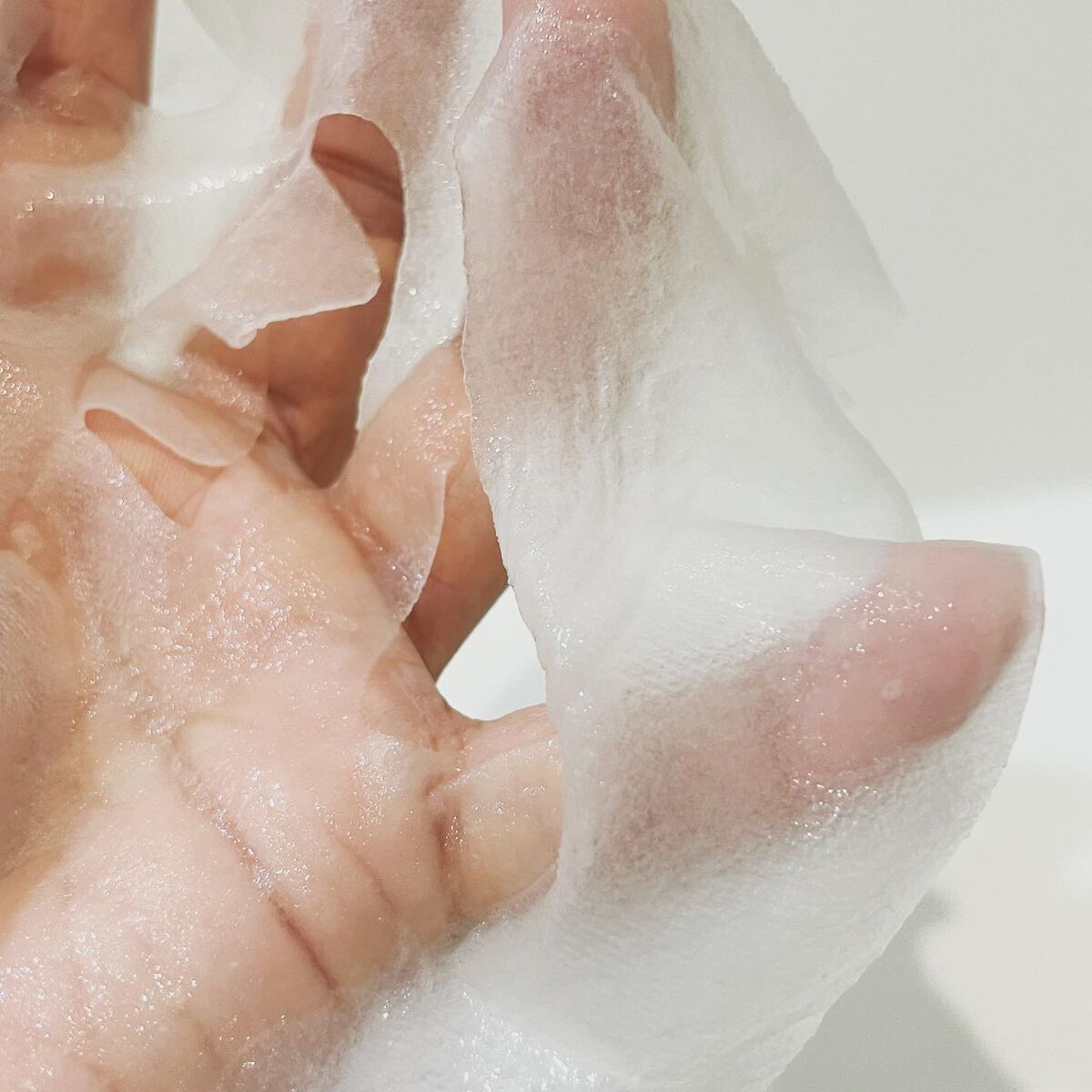 美容液は朝から使える肌馴染みの良さと、垂れない程度のとろみの加減が絶妙✨5分ほどの使用で肌がひんやりします(公式の推奨使用時間は10分)。 生地はふっくら柔らかく、美容液をしっかりと抱えてくれます。 ぱっと貼ってぱっと剥がす使い方にこの上なくぴったり!ストレスフリー💕