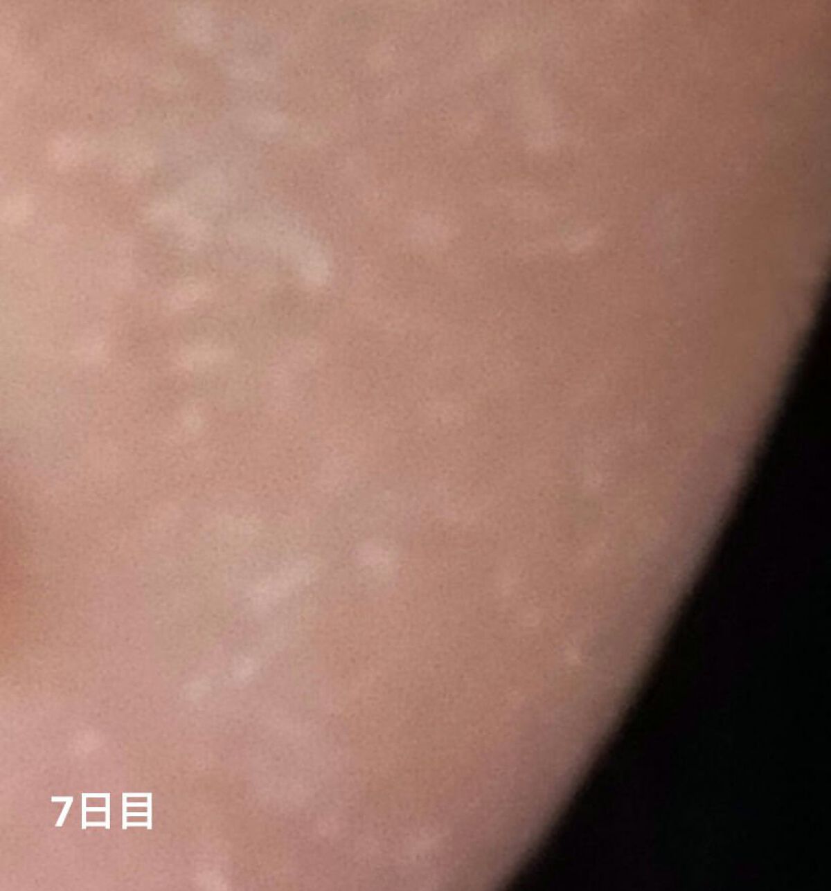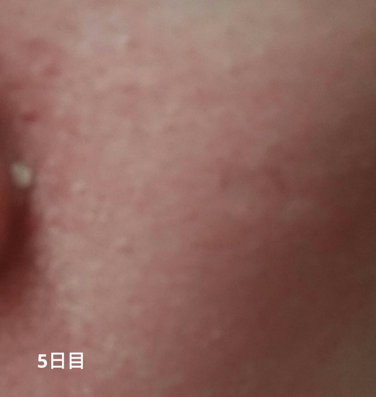 ⑤日目… 痒い!とにかく痒い! 気がつくとポリポリ😭 朝は若干の皮剥け→夕方からは 口周り、こめかみを中心に剥けてきた! 化粧水が沁みる〜💦 ⑥日目… 全体的に剥ける剥ける👯♀️ツヤ消えた… 黒い服を着るとフケみたいになると知った日😶🌫️wとにかく一日中痒かった。 ⑧日目…(写真撮り忘れ) 更に剥ける 夜ポリッシュ使ったら ボーリングの玉くらいツルピカでびびった🎳