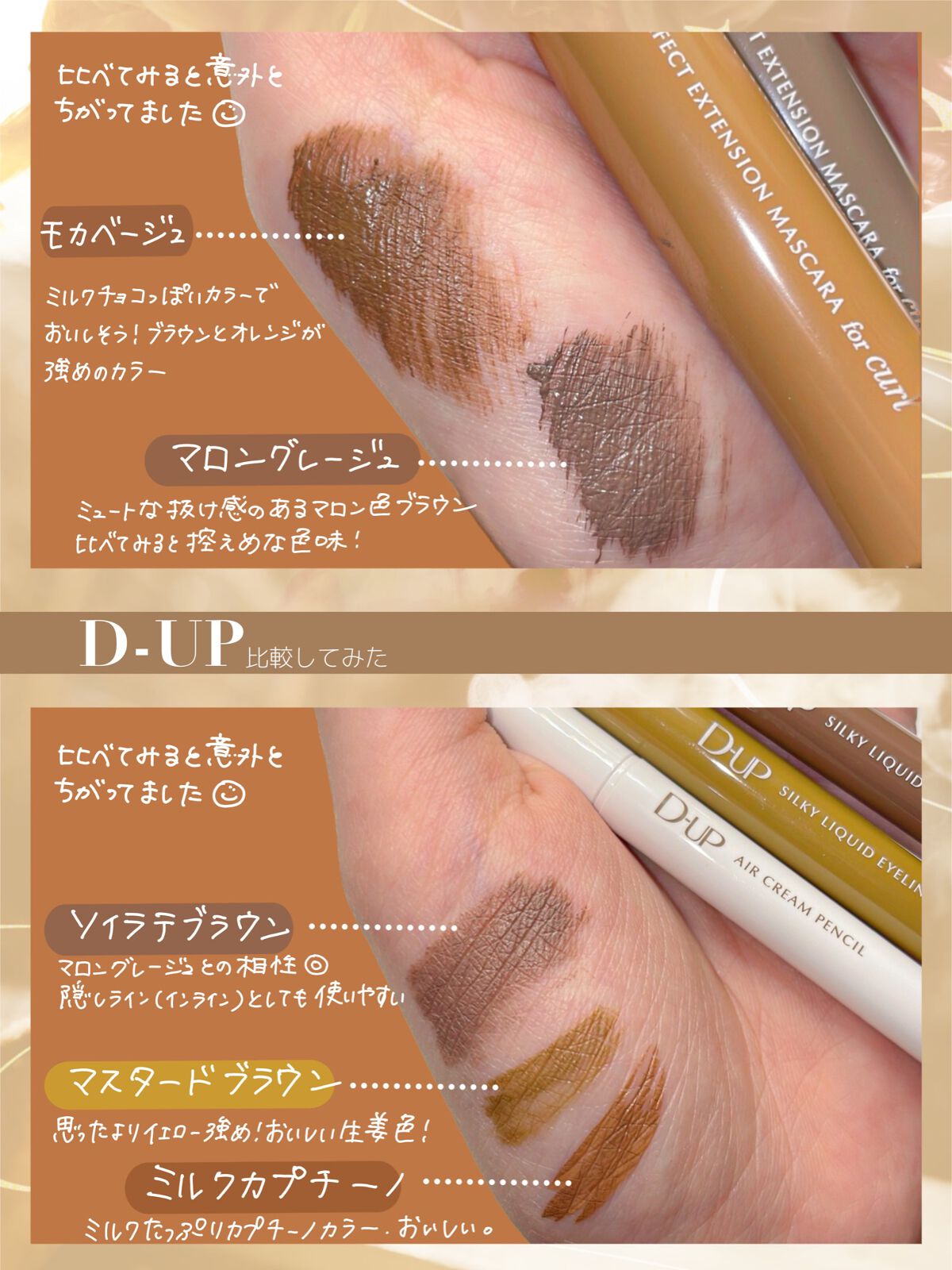 パーフェクトエクステンションマスカラ for カール マスカラ新色 『モカベージュ』 小さめブラシで小回り◎+カールブラシが目のカーブにフィットして塗りやすい🥰 シルキーリキッドアイライナー アイライナー新色 『ミルクカプチーノ』 目尻までかすれず滑らかに理想のラインが描けて、長時間キープ😘 王道ブラウンよりも、柔らかな存在感 やわらかい雰囲気を作りたいときはこれ😍