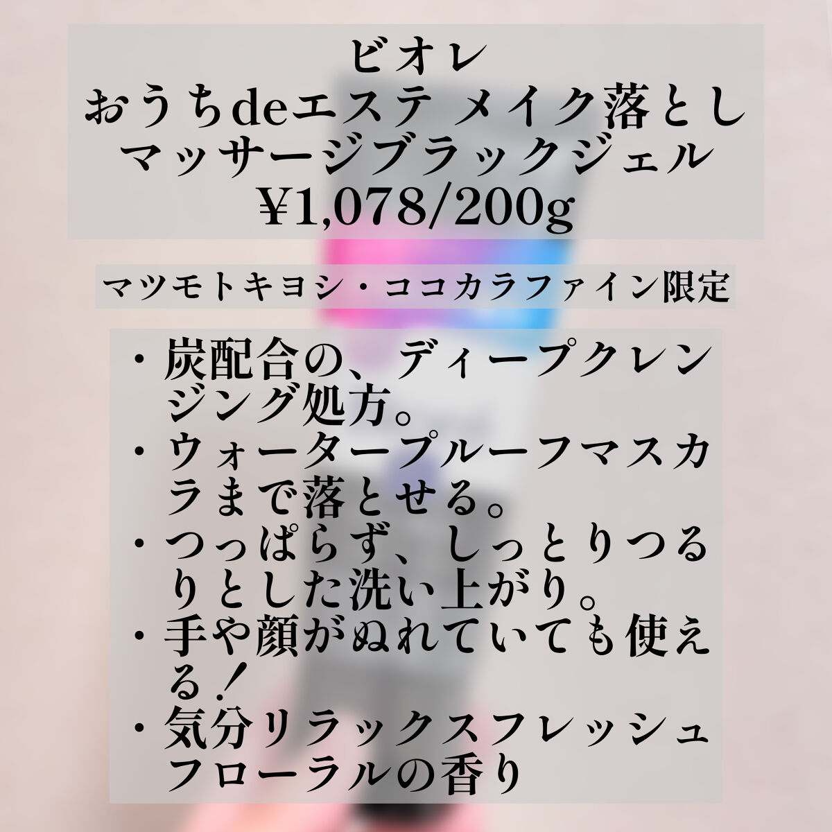 - 毛穴ケアに人気のおうちdeエステからメイク落としが発売! 炭(洗浄助剤)配合ディープクレンジング処方のブラックジェルで毛穴に入り込んだメイク汚れまでしっかり溶かし落とす! つっぱりにくく、しっとりつるりとした洗いあがり。 毎日のクレンジングがエステに変わる! ◆ウォータープルーフマスカラまで落とせます。 ◆摩擦低減*設計で肌なじみのいいやわらかいジェルタイプ ◆手や顔がぬれていても使えます。 ◆毛穴が開きやすいお風呂場での使用がおすすめです。 ◆すすぎ後の洗顔はいりません。 ◆気分リラックス フレッシュフローラルの香り *ビオレしっかりクリアジェルとの比較