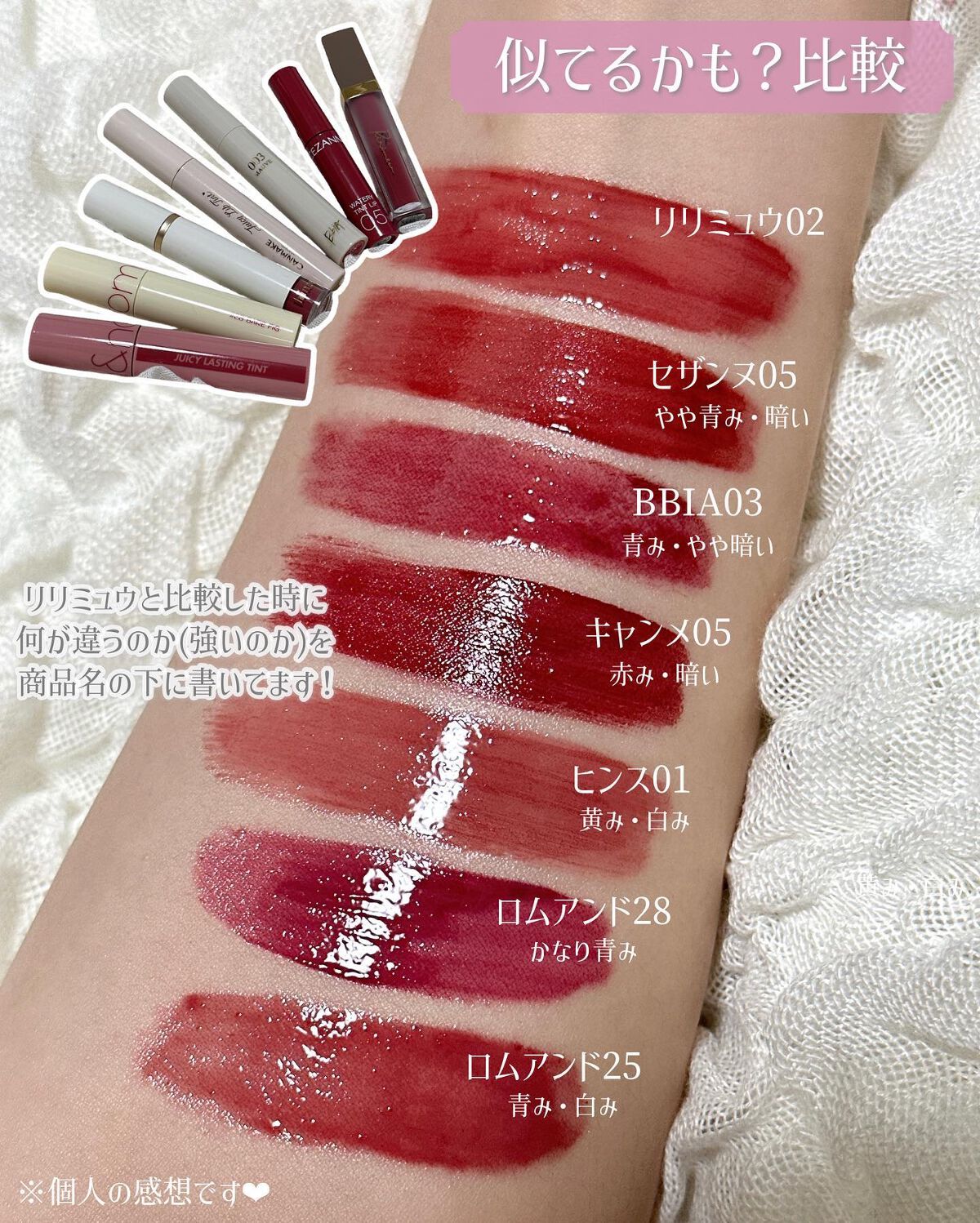 大人気リプモン、定番色の中で ブルベさん向けカラーを集めてみたよ🤍 元BAの美容オタクが、 ☁️お値段以上のプチプラコスメ紹介 ☁️元美容部員による成分解説 ☁️流行りがわかるまとめ投稿 など発信中🪄⸝⋆ ☞【 @o_bury_ 】🔍