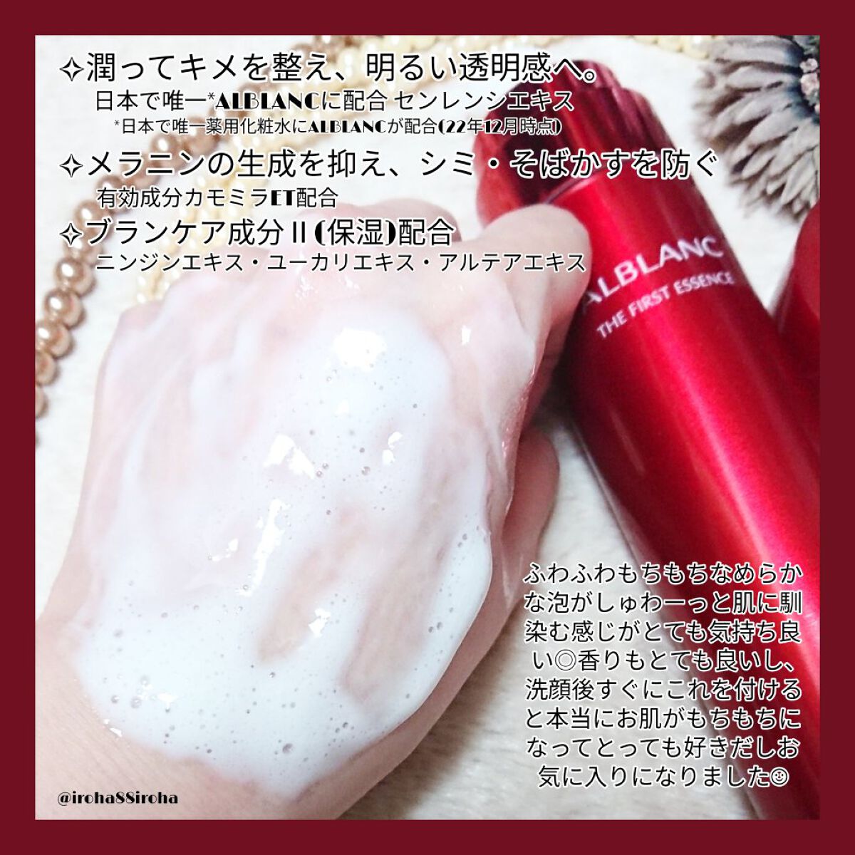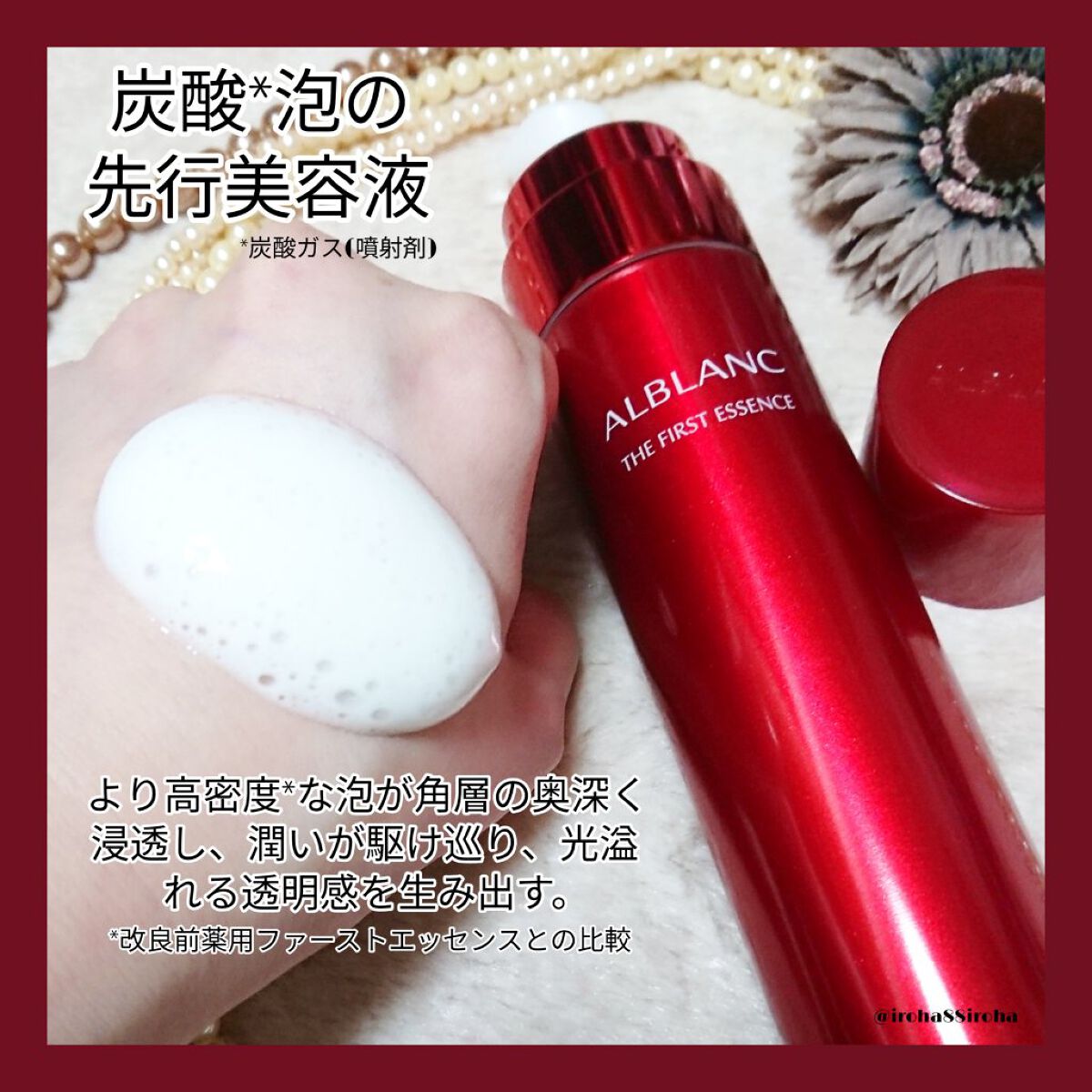 - 【医薬部外品】 潤いを巡らせる高密度*2な炭酸泡*1の美容液 より高密度*2な炭酸*1泡が角層の奥深く浸透し、うるおいが駆け巡り、光溢れる透明感を生み出す。この新たな美しさをあなたへ。 ・潤ってキメを整え明るい透明感へ:日本で唯一*3ALBLANCに配合センレンシエキス(保湿) *3 日本で唯一薬用化粧品にALBLANCが配合(22年12月時点) ・シミ・ソバカスを防ぐ*4:有効成分カモミラET配合 ・ブランケア成分Ⅱ(保湿)配合 *1 炭酸ガス(噴射剤) *2 改良前薬用ファーストエッセンスとの比較 *4 メラニンの生成を抑え、シミ・ソバカスを防ぐ