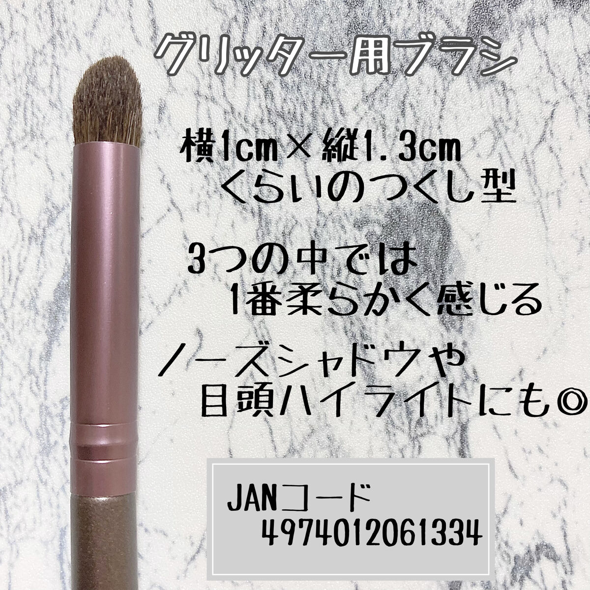 DAISOで馬毛のブラシが買えちゃう驚き! このSサイズは、二重幅や涙袋にピッタリ。 ブラシのコシはあるのに肌あたりが柔らか(短めのブラシなので直角に当てると少し刺激あり)。 小さなブラシなのに粉含みが良く、ラメなどものせやすいのでヘビロテ中。