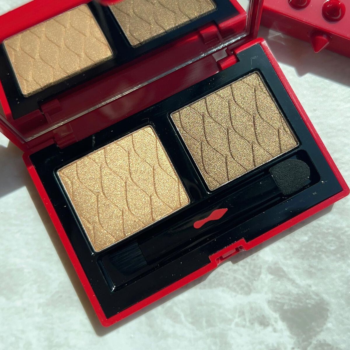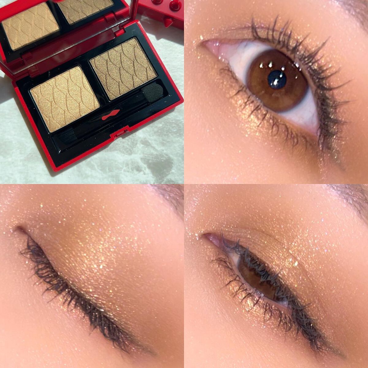 今回の新色は"まぶたに濡れたような光沢を放つ艶、光を操る立体感をプラスしリュクスなまなざしを叶えてくれる"というプリズムフォーミュラ。 確かにいつもとはちょっと違う…良いですこれ🫶❤️ ヌメッと面で光るようなツヤ感✨ テクスチャーは刻印ありタイプ、ツヤはクリームタイプに近いと思います🥰 要は刻印ありとクリームの良いとこ取りですね! ゴールドと柔らかいレッドの組み合わせ。アプレスキーとエレクトリックチェリーの中間のような色合い🤔 ゴールドとピーチカラー。今回の3色の中では一番黄みが強い。 青みがかったローズが可愛い。ぱっと見はわからないけど左上にみんな大好き青ラメが…!!