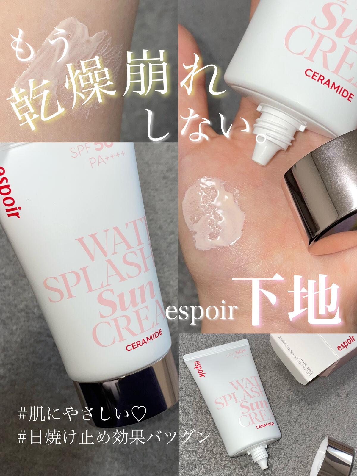 espoirウォータースプラッシュサンクリームセラミド60ml💜SPF50+PA++++💜保湿重視のピンク系日焼け止め下地‼️花粉の時期はいつも乾燥するし肌が荒れて赤くなって大変で💦下地を塗ると皮がめくれてきたりするんだけど、これは皮がめくれ...