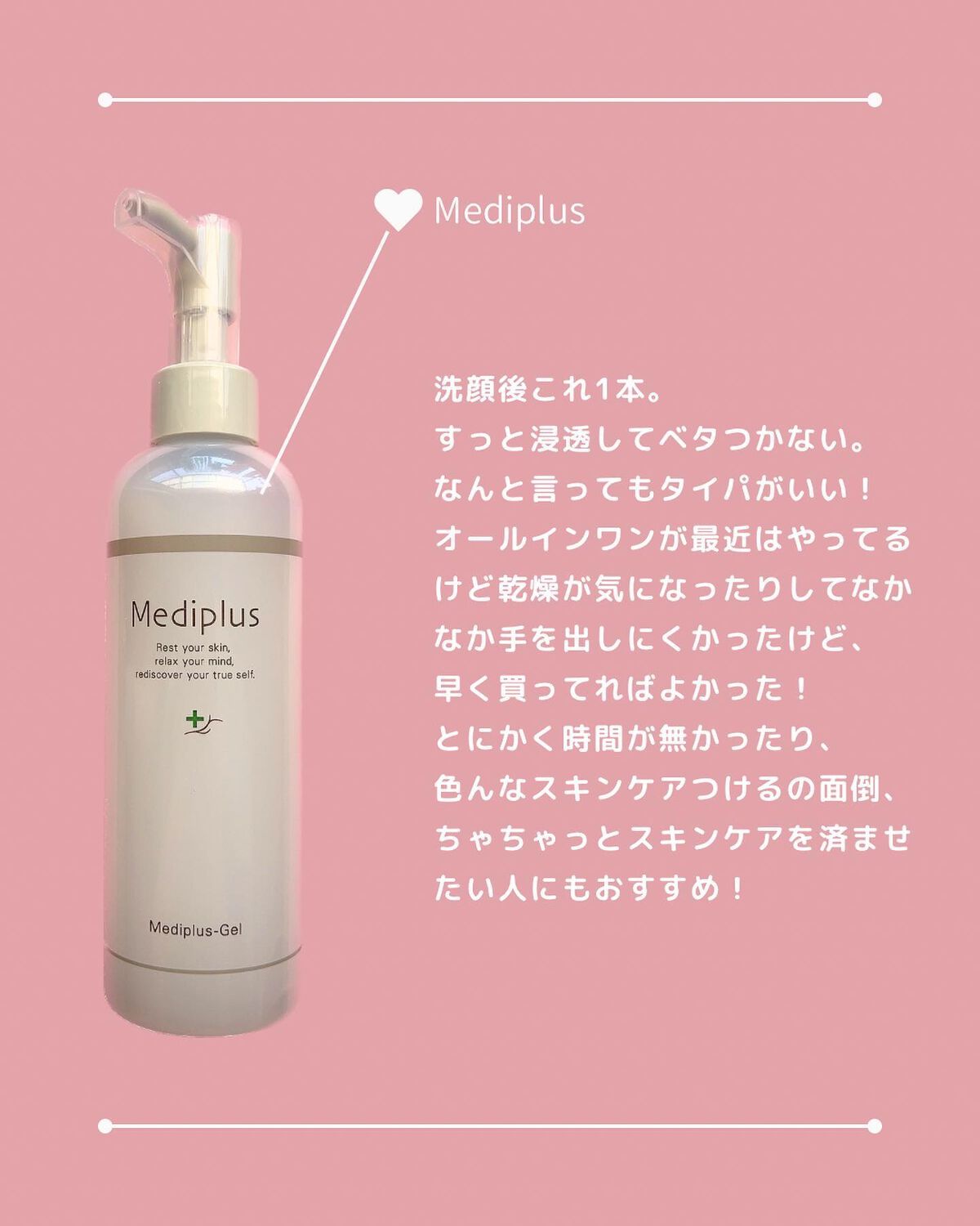 定期便が届いて、ちょうど前の分を使い切ったタイミングで開封🙂メディプラスオールインワンゲルは、化粧水・乳液・美容液・クリームの4役がこれ1本で完結します。忙しい朝や夜でも、これ1本でスキンケアが済むのが便利😌ただ、乾燥が強い時期や肌の状態によ...