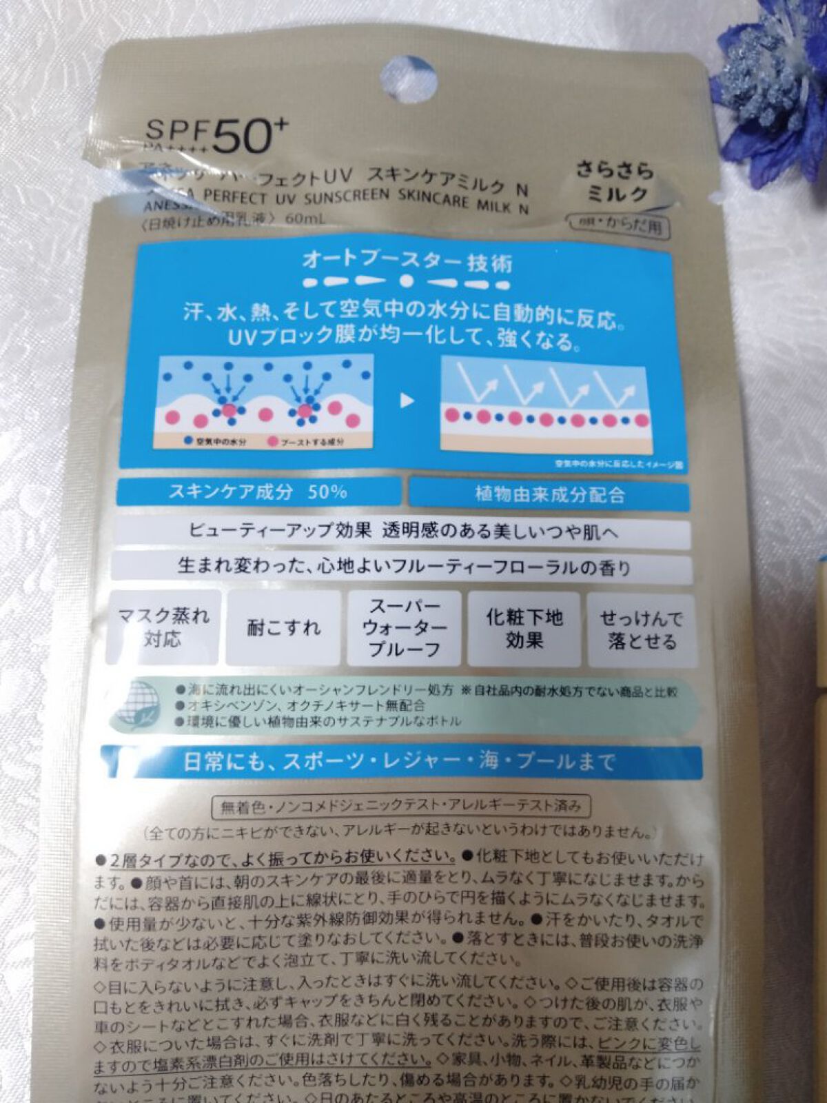 - 顔・からだ用 SPF50+ ・ PA++++ 汗、水、熱、そして空気中の水分に反応してUVブロック膜が強くなる技術搭載 最強※8 UVスキンケアミルク ※8 「最強」とはSPF50+・PA++++、及びアネッサ内ウォータープルーフ効果を意味する。 〇汗・水・熱、そして空気中の水分に自動的に反応して、UVブロック膜が強くなります。-オートブースター技術 〇透明美肌仕上げ-ビューティーアップ効果 “ビューティーアップ粉末”を新配合透明感のある美しいつや肌へ ○スキ ン ケア成 分 50% 配合 〇植物由来成分をブレンドした、紫外線による 乾燥 ダメージを防 ぐ 、うるおいを与える保湿美肌成分 黄花エキス、緑茶エキス、異性化糖、グリセリン 〇保湿 成分 コラーゲン、 スーパーヒアルロン酸※ 9 、 グリセリン ※9 アセチルヒアルロン 酸 Na 〇保湿持続 効果 ○スーパーウォータープルーフ 〇マスク蒸れ対応 〇耐こすれ ○化粧下地効果 ○せっけんで落とせ る 〇さらさらミルク ○生まれ変わった 、 心地よいフルーティーフローラルの香り 〇大気中に浮遊する微粒子、 PM2 .5 などから肌を保護 し ま す。-微粒子付着防止対応 ○砂が肌 につきにくいサンドプルーフ効果 〇海に流れ出にくいオーシャンフレンドリー処方※6 ※6 自社品内の耐水処方でない商品と比較 ○環境に優しいサステナブルなボトル ○植物由来の原料を一部使用した袋 〇オキシベンゾン 、 オクチノキサート無配合 ○無着色・ ノンコメドジェニックテスト・ アレルギーテスト済み (全ての方にニキビができない、アレルギ ーが起きないというわ けではありません)