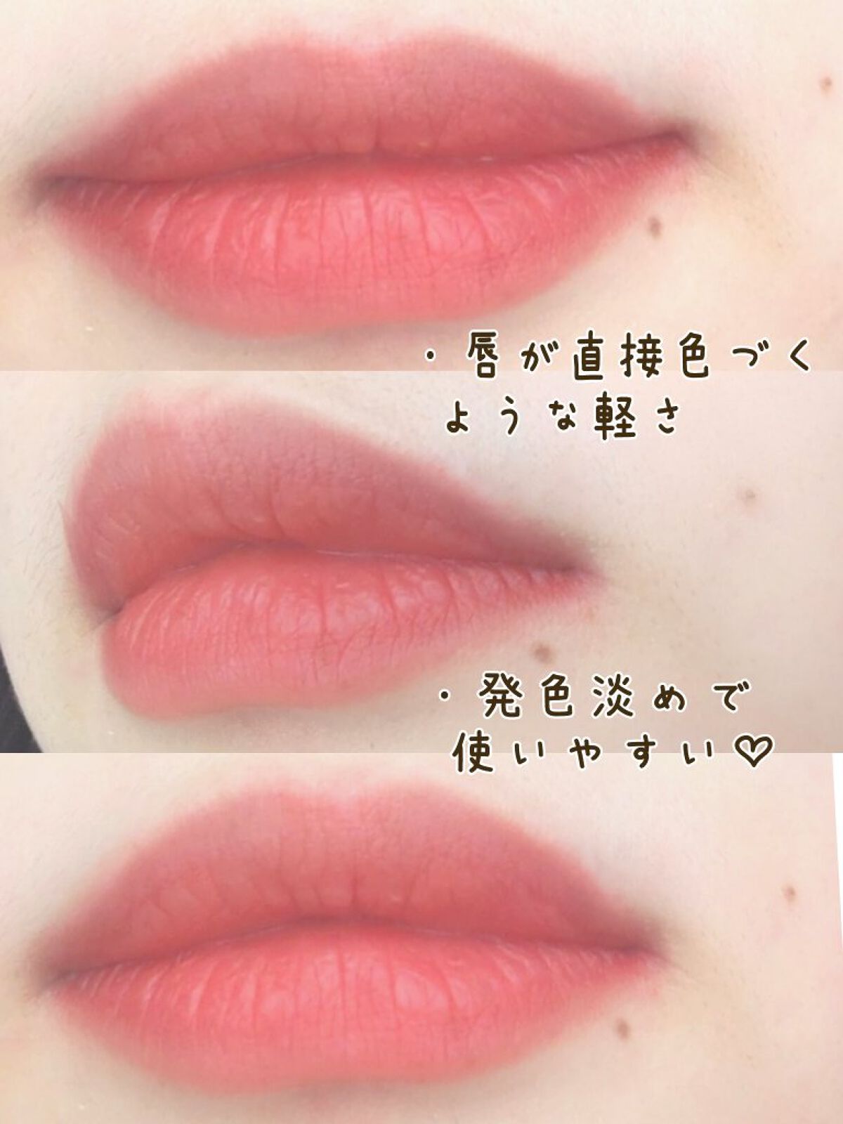 ・じゅんわり染まるオレンジまじりのレッド ・ぽんぽん塗りでほんのり発色 ・重ね塗りで強めに色をだせます! ・飲食でとれますが落ち方がキレイです✨ ・ちょいツヤのうるみリップ ・軽い塗り心地 ・保湿されます! ・色味が強すぎないカジュアルなレッドで 普段使いしやすい! ・ミニサイズで持ち運び⭕ ・塗り方で色の強さを変えられるので 色んな雰囲気に合わせやすい ・人気すぎて売り切れてます😭 なにこの使いやすさ…!感動😭 主張が強すぎない赤なので気軽に使えます✨✨ これは毎日使いそう…♡