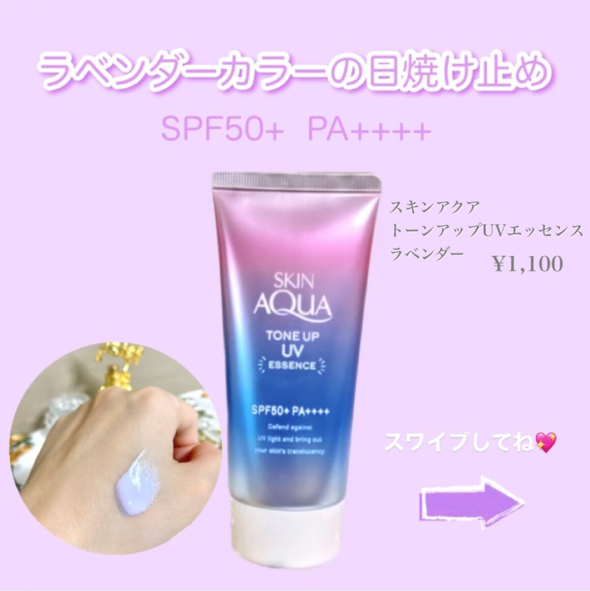 スキンアクアトーンアップUVエッセンスブルー&ラベンダー私愛用の日焼け止めです!いつもはラベンダーを使用していたのですが今年新発売のブルーの日焼け止めも使用しています!どちらも塗るだけでトーンアップするので周りから肌白いねと褒めていただけます...