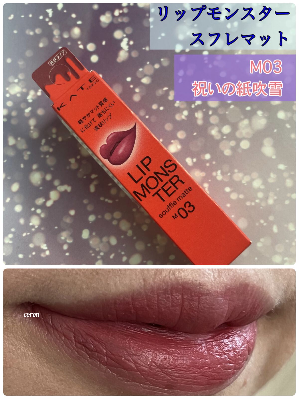 大人気のケイトのリップモンスターの、マットタイプのリップです! 高発色で、人塗りでも結構色づいてくれました! 塗りすぎ注意です! M03祝いの紙吹雪の色味は、赤系で、大人っぽい感じの色味が好きな方におすすめです!