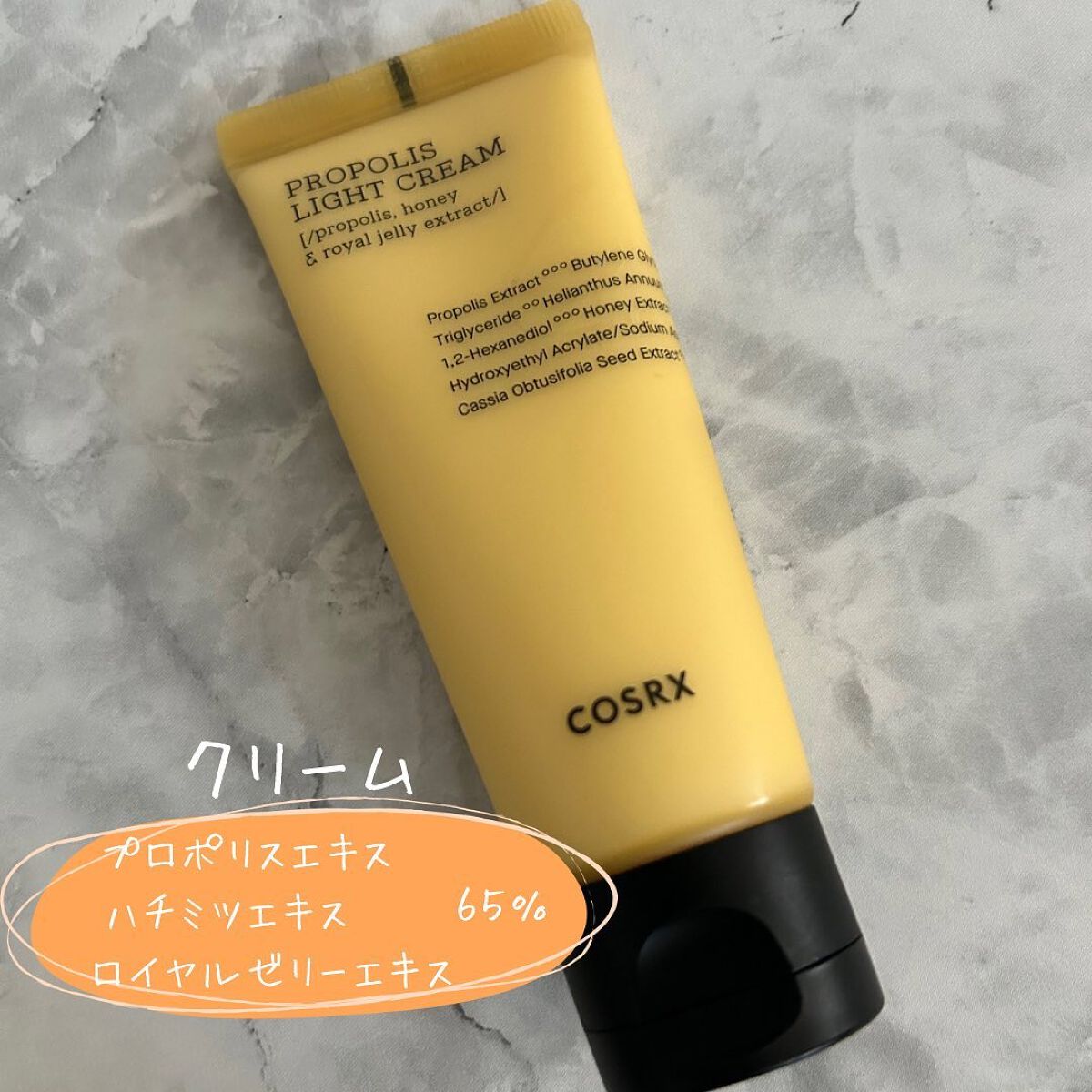 COSRXのフルフィットプロポリスライトクリームは容器に入ったタイプもチューブタイプもどちらもリピした事があるお気に入りのクリームの1つです。 フルフィットベリアコンプレックス(プロポリスエキス・蜂蜜エキス・ロイヤルゼリーエキス)が65%含まれており、肌に豊富な栄養と保湿とハリを与えるプロポリスクリーム。 ソフトでしっとりしたクリームテクスチャーで、完璧な仕上がりの栄養たっぷりのアンプルクリーム。