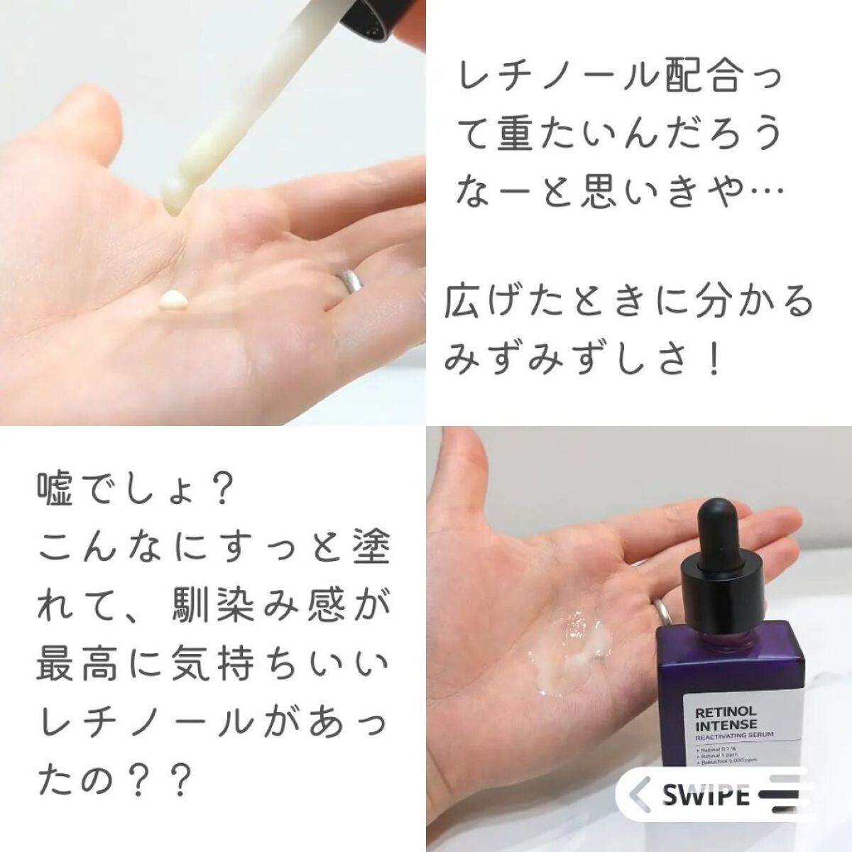 レチノール0.1%&バクチオール5,000PPM(整肌成分)が配合されている美容液💜 イブヴィーガン認証済みで、レチノールA反応が心配な方も使いやすいと思います◎ スポイトタイプだから量の調整がしやすくパープル×英字のボトルがかっこいい。
