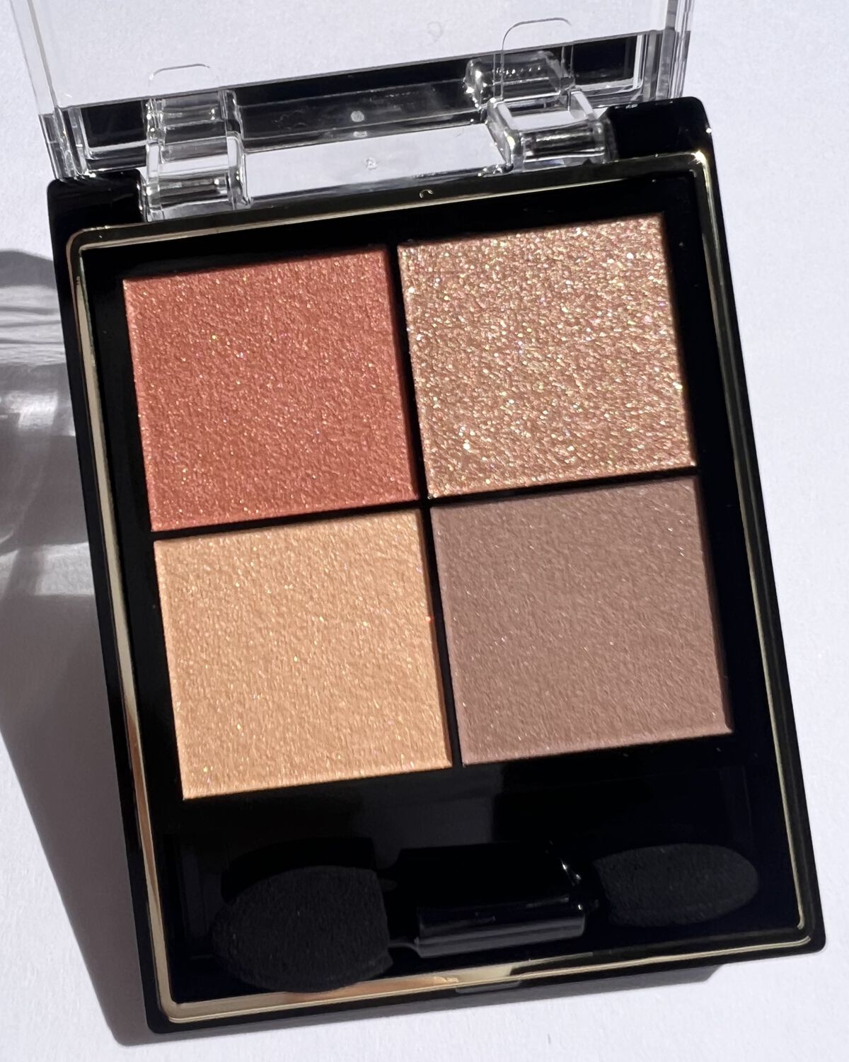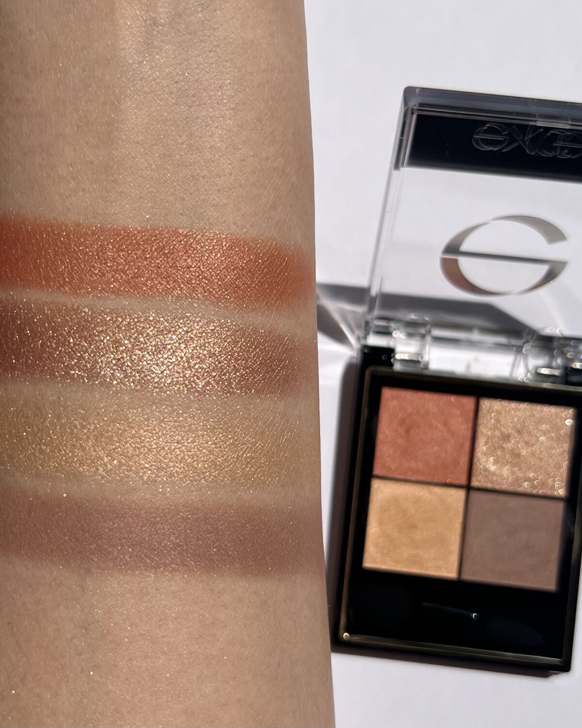 - 1.重ねてもくすまないクリアな発色。ナチュラルに溶け合う絶妙4カラー。 ツヤタイプ(左上・左下カラー):アイホール全体にぼかしたり、目尻へのポイント使いも。 ラメタイプ(右上カラー):アイホール中心や下まぶたにきらめきのアクセント。 マットタイプ(右下カラー):単色で陰影を付けたり、ツヤタイプと重ねてニュアンスをプラス。 2.うっとりするほどリッチな質感で粉飛びしないのに、軽いタッチで伸びて重ねやすいテクスチャー。 3.スクワラン(保湿)配合で目元の乾燥を防ぎます。 [PERFORMANCE] 色と質感の重ね着を楽しむ、ファッション感覚アイシャドウパレット [DESIGN] ・まぶたにひっかからない、なめらかな上質チップ ・薄型コンパクトだからポーチの中でかさばらない [QUALITY] 1.重ねてもくすまないクリアな発色 ナチュラルに溶け合う絶妙4カラー 2.パールの重ね技でまぶたに極上のツヤ感 微細多色 カラーパール 銀コーティング ガラスパール* excel GOLD-MIX処方(金パール配合)* (*右上のシャイニーカラーのみ) 3.うっとりするほどリッチな質感で粉飛び知らず!なのに、軽いタッチで伸びて重ねやすい 4.スクワラン(保湿)配合で目元の乾燥を防ぐ
