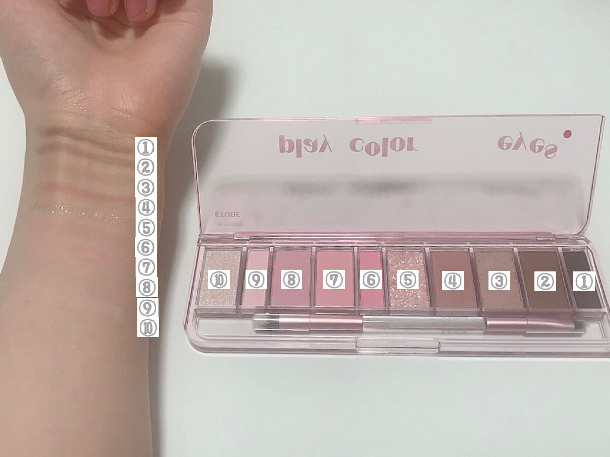 [商品]プレイカラーアイシャドウ [色]クールバレリーナ [容量・税込価格]5.7g・2,970円 [密着感]マットシャドウの密着感はとっても良いです 真ん中⑤番の大きめのラメは擦ると取れてしまうので、使用するときはあまり目を触らないよう⚠️ 普通に生活する分には全く問題ないです🙆♀️ [発色]発色が良いです⭕️濃すぎず薄すぎず、グラデーションメイクもやりやすかったです✨ パッケージもピンク色で可愛く、ブラシも付属していて使い勝手が良いのもとっても良いです💮💯 同じラインで、ブラウン基調のアイシャドウやティント等があるので組み合わせて使うとより華やかで統一感のあるメイクが出来るかと思います✨