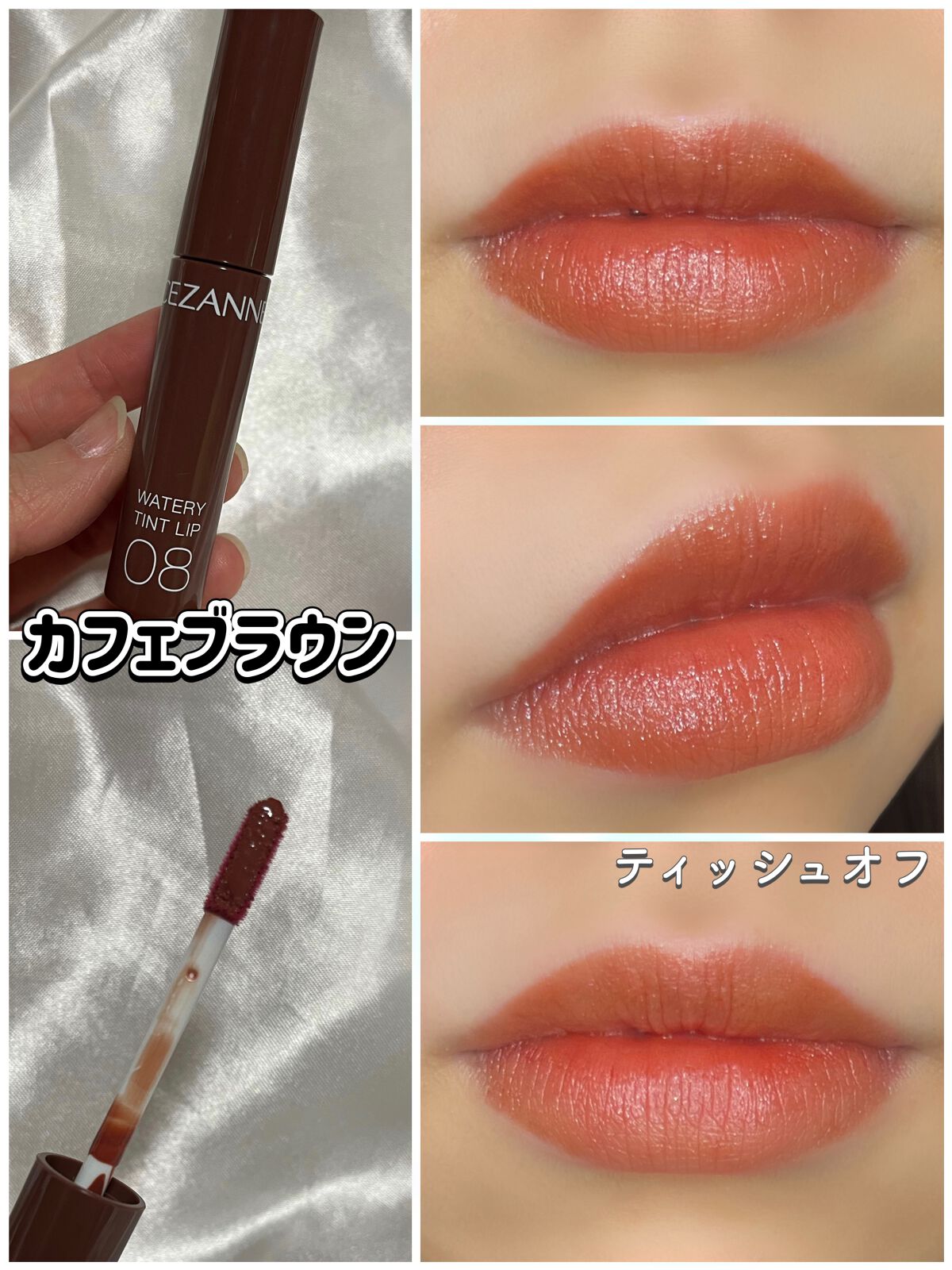 - ツヤ×色×潤いをキープする、セザンヌの新濡れツヤリップ みずみずしい濡れツヤ感ある仕上がりで、発色とツヤが長続きするティントリップです。ティントの発色を透明のベールで覆うリップコートのような処方で、ツヤ感と色をキープします。さらに、唇表面のべたつきは少なく、しっとり潤うオイルinウォーター処方を採用しています。