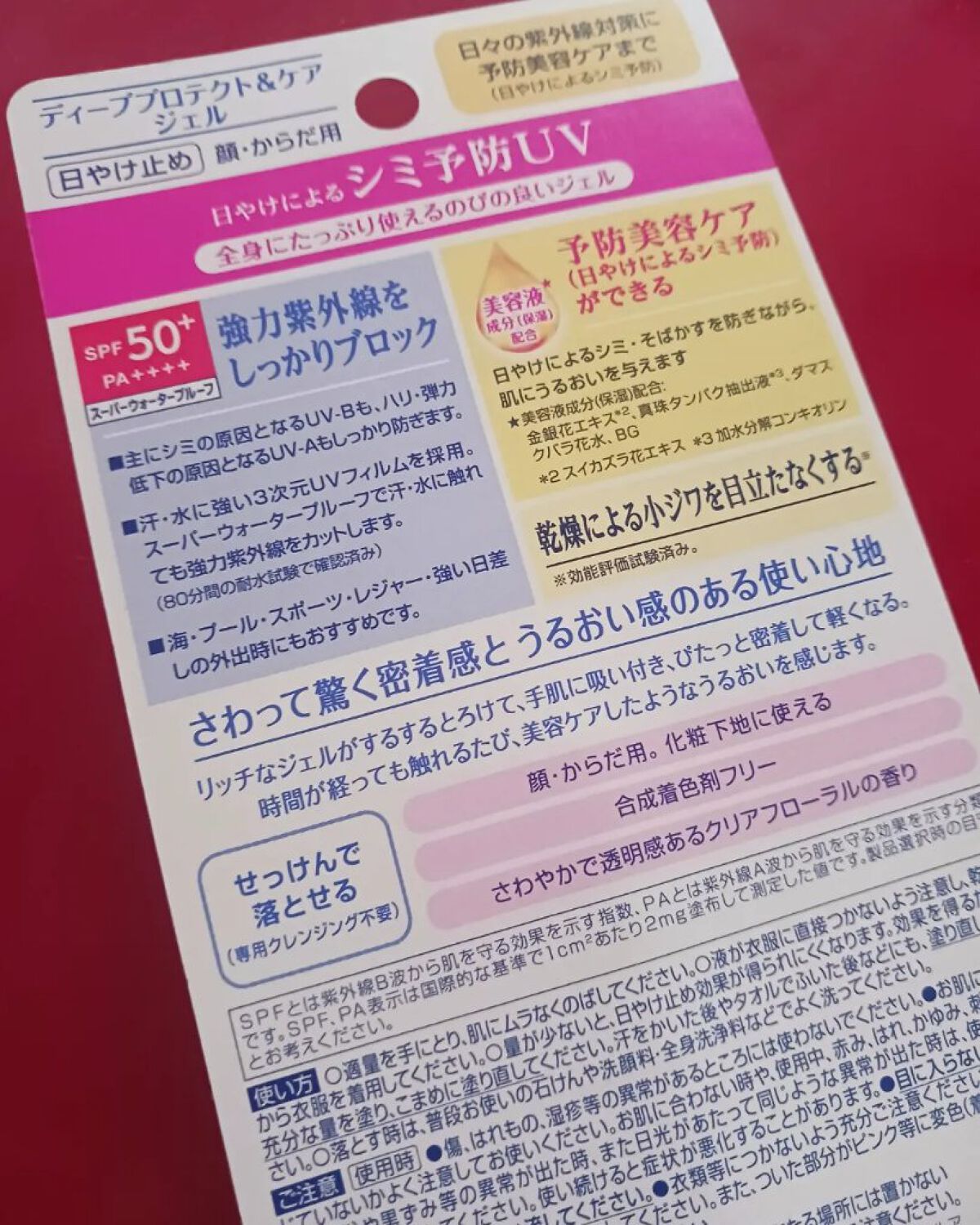 - 全身たっぷり使えるのびのいいジェル 強力紫外線をしっかりブロックしながら、予防美容(日やけによるシミ予防*1)ができる美容ケアUV *1日やけによるシミ・ソバカスを防ぐ ■SPF50+/PA++++ ハリ・弾力低下の原因となるUV-Aも、主にシミの原因となる UV-Bも防ぎます。 ■汗・水に強い3次元UVフィルムを採用 スーパーウォータープルーフで汗・水に触れても強力紫外線をカットします。(80分間の耐水試験で確認済み) ●日やけによるシミ・そばかすを防ぎながら、肌にうるおいを与えます。美容液成分★(保湿)配合。 ★ジェル:金銀花エキス*5、真珠タンパク抽出液*6、ダマスクバラ花水、BG ★エッセンス: 金銀花エキス*5、真珠タンパク抽出液*6、チューベロース多糖体、BG *5スイカズラ花エキス *6 加水分解コンキオリン ●乾燥による小ジワを目立たなくする*3 *3効能評価試験済み ●さわって驚く密着感とうるおい感のある使い心地