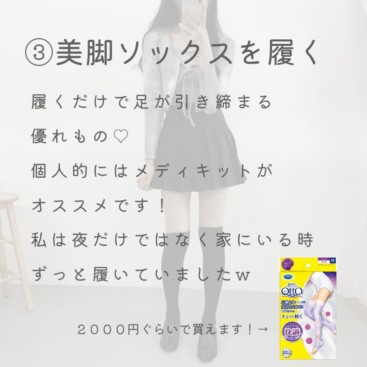 特にふくらはぎをマッサージしてください🙇 お風呂に入っている時は筋肉が柔らかくなるので 効果2倍!! くるぶしから膝したまでマッサージをしていき、膝の裏側のくぼみを押すことで老廃物が流れていきます!! 痛気持ちいぐらいがBEST👍 足パカは数年前に凄い流行りましたよね~! 足を開く→閉じるの繰り返し!! お腹にも結構きて意外ときついんです😣💦 でもその分効果ある! 履くだけて足が引き締まる優れもの♡ 個人的にはメディキットがオススメです!! これは1週間やるだけでも美脚を実感できます!!