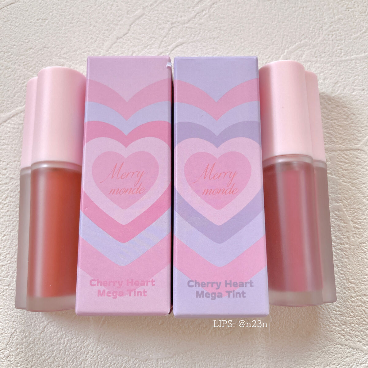 🩷MerryMonde💜CherryHeartMegaTint 09ペールチェリー 10ロージーチェリーポップで可愛いパッケージにハートのデザインが可愛いリップ💖しっとり塗れて、ふんわり仕上がるマットタイプのティント少女らしさと都会的な魅力を...