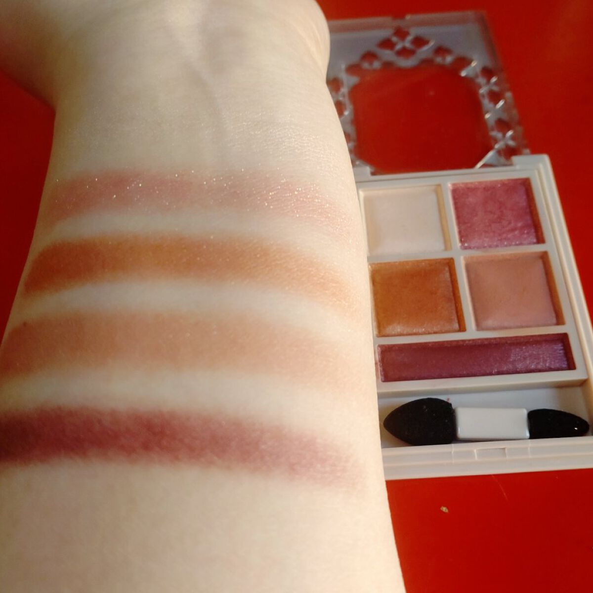 プチプラのクオリティじゃないっ!! 発売前からチェックしていたけれど、ここまで可愛いとは…😆 絶妙カラーで目もとのくすみを飛ばして*明るい印象に🩷 横割りグラデーションでメイクし、立体感をより出したかったので最後に1番左のカラーを上まぶたの真ん中と涙袋にのせています🙆 肌馴染みも良くて粉飛びも感じにくかったです💕 ブラウンの方も店頭に出てたら買おうかな💓