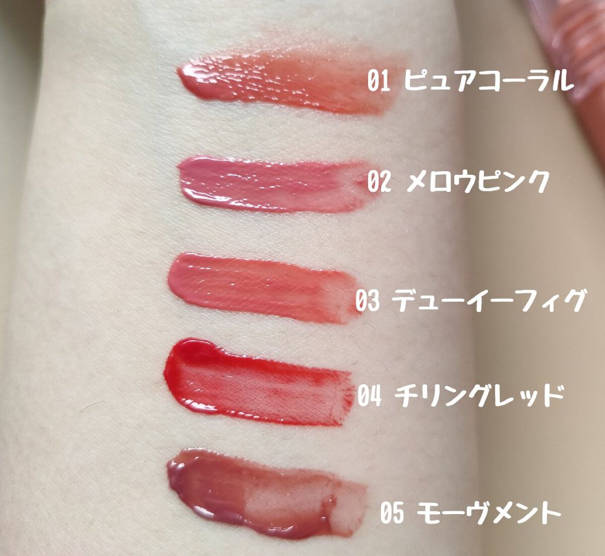 - <ピュアコーラル> 水、トリメチルシロキシフェニルジメチコン、オクチルドデカノール、ダイマージリノール酸ダイマージリノレイルビス(ベヘニル/イソステアリル/フィトステリル)、ポリアミド-8、リンゴ酸ジイソステアリル、ポリソルベート60、BG、セタノール、グリセリン、セスキオレイン酸ソルビタン、変性アルコール、(アクリル酸ヒドロキシエチル/アクリロイルジメチルタウリンNa)コポリマー、ヨーロッパキイチゴ葉エキス、(カプリル酸/カプリン酸)ヤシアルキル、加水分解ヒアルロン酸、(ヒマシ油/IPDI)コポリマー、(カプリル酸/カプリン酸/コハク酸)トリグリセリル、エチルヘキシルグリセリン、トリ(カプリル酸/カプリン酸)グリセリル、カプリリルグリコール、1,2-ヘキサンジオール、トコフェロール、ポリアクリレート-13、ポリイソブテン、テトラ(ジ-t-ブチルヒドロキシヒドロケイヒ酸)ペンタエリスリチル、イソステアリン酸ソルビタン、ポリソルベート20、デヒドロ酢酸、フィチン酸Na、香料、酸化チタン、黄5、赤227、青1 <メロウピンク> 水、トリメチルシロキシフェニルジメチコン、オクチルドデカノール、ダイマージリノール酸ダイマージリノレイルビス(ベヘニル/イソステアリル/フィトステリル)、ポリアミド-8、リンゴ酸ジイソステアリル、ポリソルベート60、BG、セタノール、グリセリン、セスキオレイン酸ソルビタン、変性アルコール、(アクリル酸ヒドロキシエチル/アクリロイルジメチルタウリンNa)コポリマー、ヨーロッパキイチゴ葉エキス、(カプリル酸/カプリン酸)ヤシアルキル、加水分解ヒアルロン酸、(ヒマシ油/IPDI)コポリマー、(カプリル酸/カプリン酸/コハク酸)トリグリセリル、エチルヘキシルグリセリン、トリ(カプリル酸/カプリン酸)グリセリル、カプリリルグリコール、1,2-ヘキサンジオール、トコフェロール、ポリアクリレート-13、ポリイソブテン、テトラ(ジ-t-ブチルヒドロキシヒドロケイヒ酸)ペンタエリスリチル、イソステアリン酸ソルビタン、ポリソルベート20、デヒドロ酢酸、フィチン酸Na、香料、酸化チタン、黄5、赤227、青1 <デューイーフィグ> 水、トリメチルシロキシフェニルジメチコン、オクチルドデカノール、ダイマージリノール酸ダイマージリノレイルビス(ベヘニル/イソステアリル/フィトステリル)、ポリアミド-8、リンゴ酸ジイソステアリル、ポリソルベート60、BG、セタノール、グリセリン、セスキオレイン酸ソルビタン、変性アルコール、(アクリル酸ヒドロキシエチル/アクリロイルジメチルタウリンNa)コポリマー、ヨーロッパキイチゴ葉エキス、(カプリル酸/カプリン酸)ヤシアルキル、加水分解ヒアルロン酸、(ヒマシ油/IPDI)コポリマー、(カプリル酸/カプリン酸/コハク酸)トリグリセリル、エチルヘキシルグリセリン、トリ(カプリル酸/カプリン酸)グリセリル、カプリリルグリコール、1,2-ヘキサンジオール、トコフェロール、ポリアクリレート-13、ポリイソブテン、テトラ(ジ-t-ブチルヒドロキシヒドロケイヒ酸)ペンタエリスリチル、イソステアリン酸ソルビタン、ポリソルベート20、デヒドロ酢酸、フィチン酸Na、香料、酸化チタン、黄5、赤227、青1 <チリングレッド> 水、トリメチルシロキシフェニルジメチコン、オクチルドデカノール、ダイマージリノール酸ダイマージリノレイルビス(ベヘニル/イソステアリル/フィトステリル)、ポリアミド-8、リンゴ酸ジイソステアリル、ポリソルベート60、BG、セタノール、グリセリン、セスキオレイン酸ソルビタン、変性アルコール、(アクリル酸ヒドロキシエチル/アクリロイルジメチルタウリンNa)コポリマー、ヨーロッパキイチゴ葉エキス、(カプリル酸/カプリン酸)ヤシアルキル、加水分解ヒアルロン酸、(ヒマシ油/IPDI)コポリマー、(カプリル酸/カプリン酸/コハク酸)トリグリセリル、エチルヘキシルグリセリン、トリ(カプリル酸/カプリン酸)グリセリル、カプリリルグリコール、1,2-ヘキサンジオール、トコフェロール、ポリアクリレート-13、ポリイソブテン、テトラ(ジ-t-ブチルヒドロキシヒドロケイヒ酸)ペンタエリスリチル、イソステアリン酸ソルビタン、ポリソルベート20、デヒドロ酢酸、フィチン酸Na、香料、黄5、赤227、青1 <モーヴメント> 水、トリメチルシロキシフェニルジメチコン、オクチルドデカノール、ダイマージリノール酸ダイマージリノレイルビス(ベヘニル/イソステアリル/フィトステリル)、ポリアミド-8、リンゴ酸ジイソステアリル、ポリソルベート60、BG、セタノール、グリセリン、セスキオレイン酸ソルビタン、変性アルコール、(アクリル酸ヒドロキシエチル/アクリロイルジメチルタウリンNa)コポリマー、ヨーロッパキイチゴ葉エキス、(カプリル酸/カプリン酸)ヤシアルキル、加水分解ヒアルロン酸、(ヒマシ油/IPDI)コポリマー、(カプリル酸/カプリン酸/コハク酸)トリグリセリル、エチルヘキシルグリセリン、トリ(カプリル酸/カプリン酸)グリセリル、カプリリルグリコール、1,2-ヘキサンジオール、トコフェロ