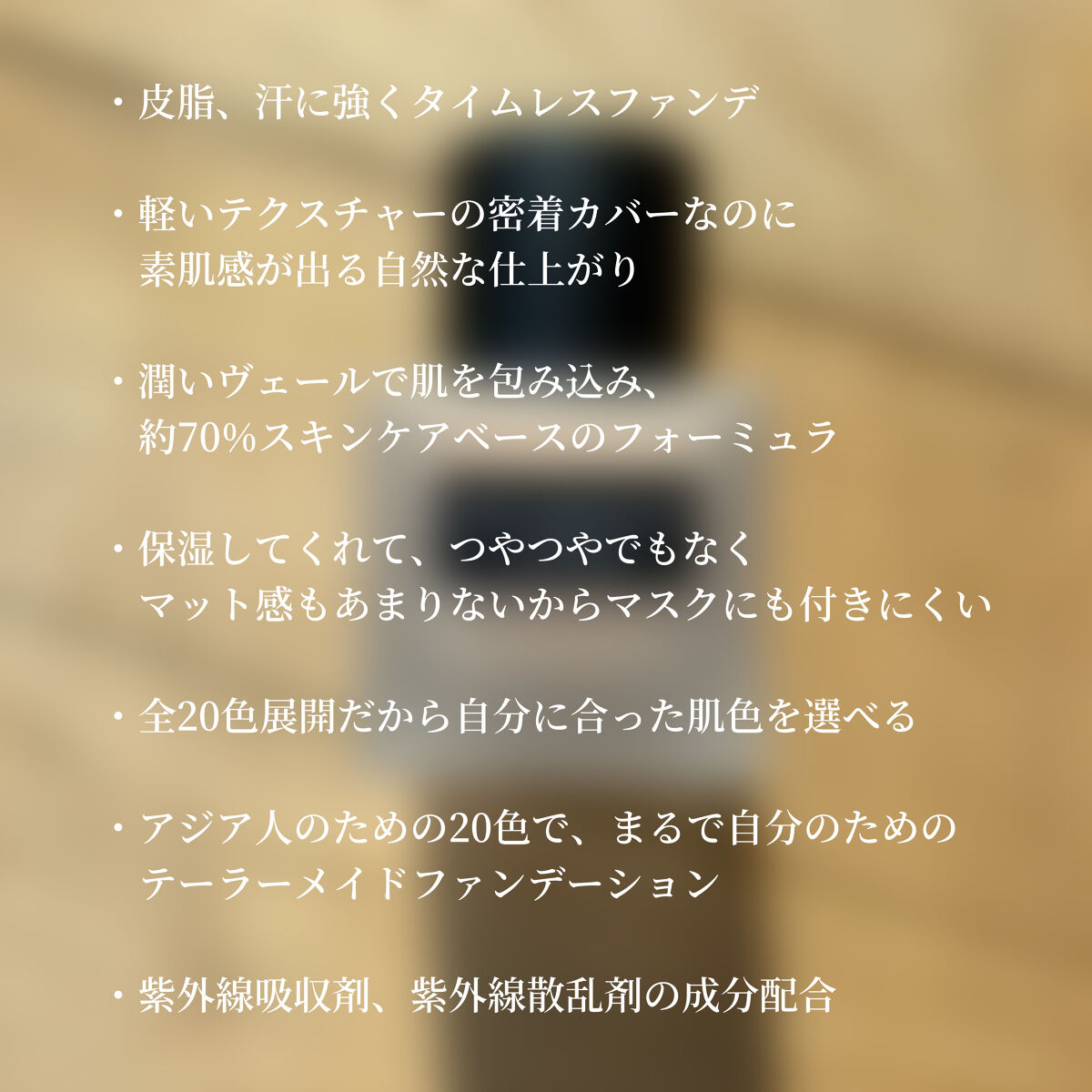 - 【この商品はリニューアルしました】 https://lipscosme.com/products/631202 薄く、軽く、そして続く。 あなたの個性を輝かせる、素肌美ファンデーション。 約70%スキンケアベースのフォーミュラが、潤いヴェールで肌を心地よく包み込む。 ファンデーションを感じさせないほど、薄くて軽いテクスチャー。 皮脂、汗に強く、時間が経っても崩れない。 カバー力がありながらも、素肌に溶け込むかのような自然な仕上がり。 アジア人のための20色で、テーラーメイドされたように個性輝く。 まるで美しい素肌を纏うような体験を、あなたの肌で。