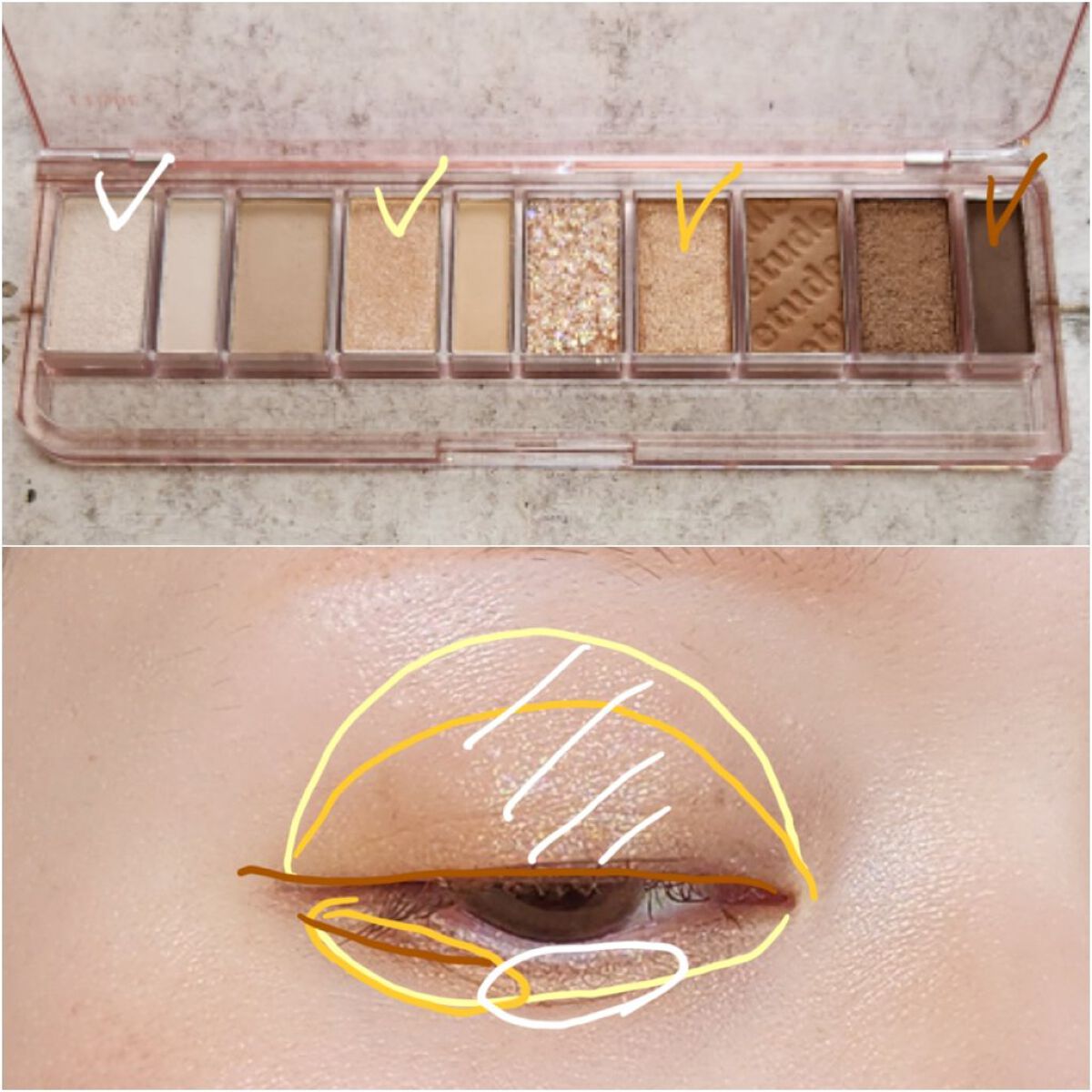 - 肌なじみの良い、鮮やかな発色で目元を華やかに彩る捨て色なしの10色アイシャドウパレット 異なる3種のテクスチャーを自由に組み合わせて、グラデーションも思いのままに。 NEW 2023.4 ・肌トーンにあう配色を詰め込んだトレンドカラー 肌トーンに合わせて、自分に似合うトレンドカラーが楽しめる♡ パーソナルカラー×トレンドカラーの掛け合わせパレットで、デイリーメイクもスペシャルメイクも気分にあわせてなりたい自分に! ・むにゅっとジェル質感ラメで高密着、煌めく目元 パレットの中でもポイントとなる大きめ粒子のラメは、ジェルのような新質感で落ちにくく肌にぴったりと密着します。キラキラとした目元をキープします。 ・使うカラーは大きめに!リアル捨て色なしパレット ベースやラメのよく使うカラーと締め色や濃い色等の減りが少ないカラーを異なるサイズで詰め込んだ、リアル捨て色なしパレット! <使用方法> 付属のデュアルシャドウブラシでベースカラーをまぶた全体に塗り広げます。細いブラシでグラデーションや目尻、アイライン、涙袋などのポイントカラーをのせて仕上げます。